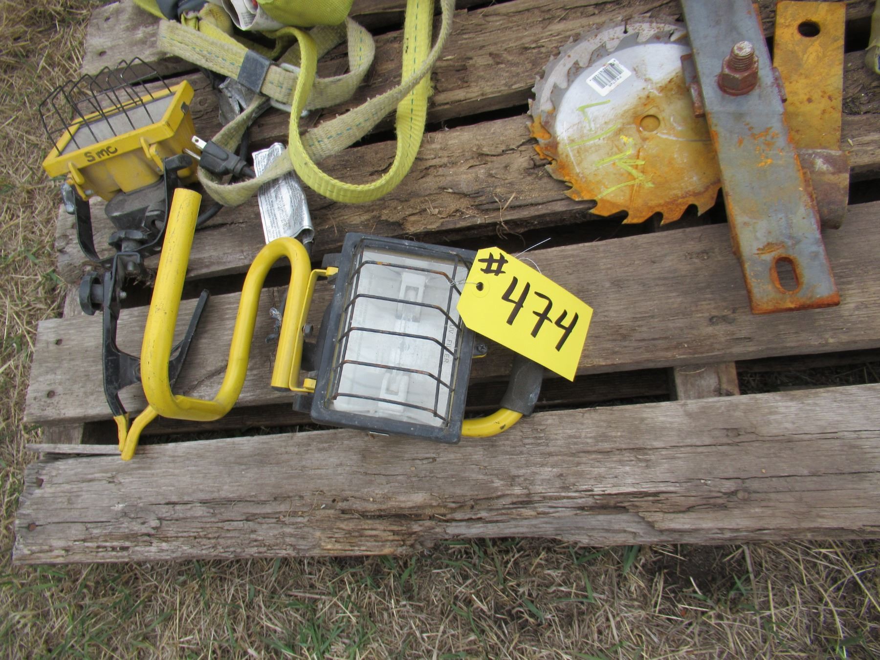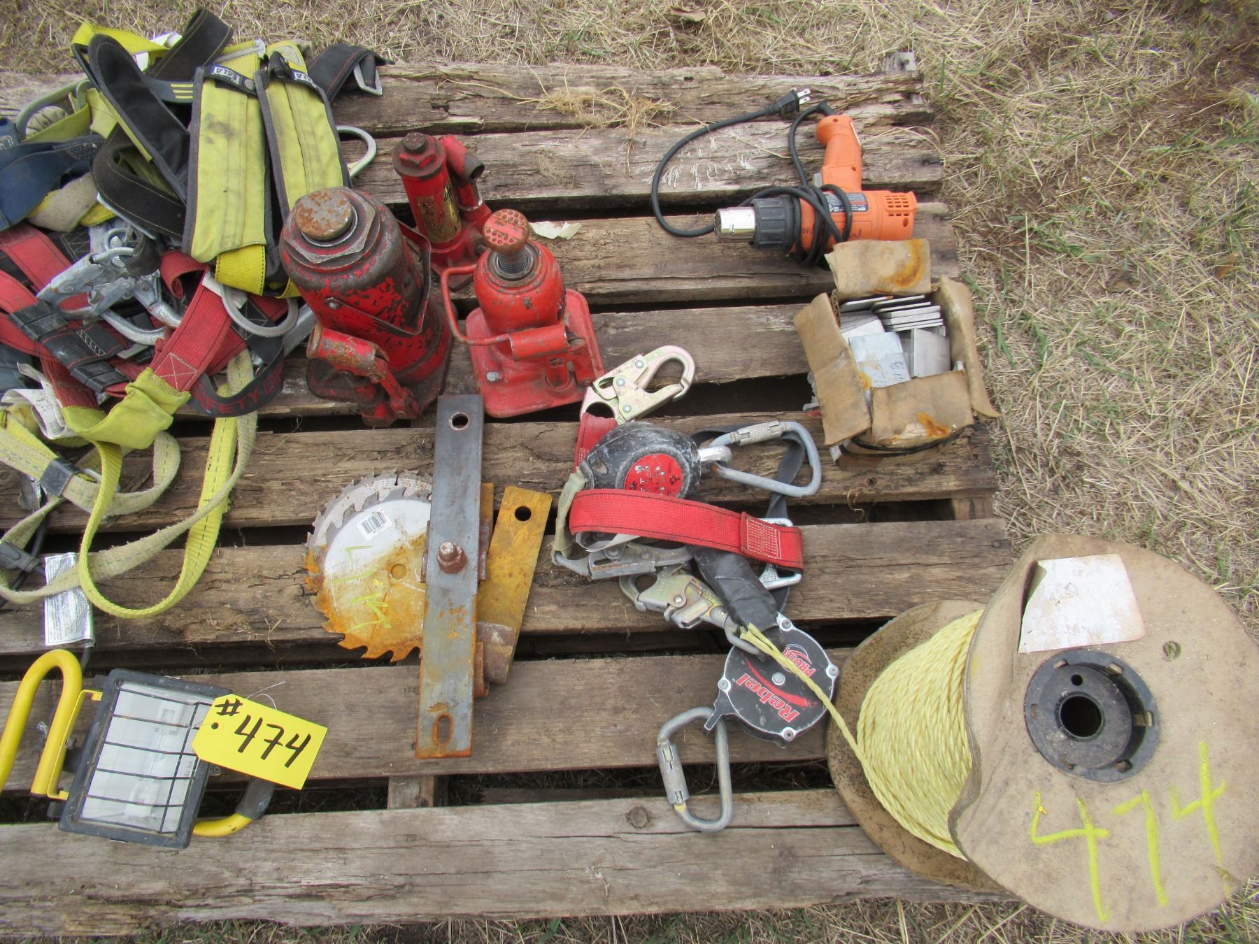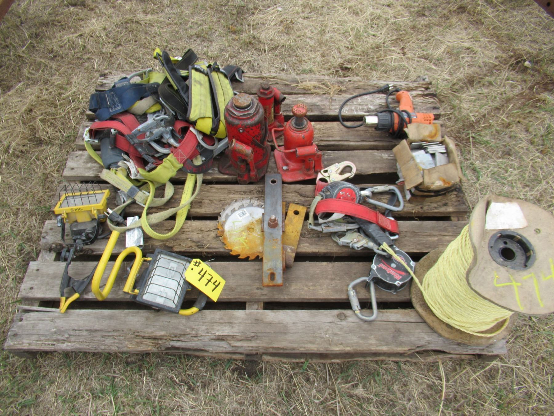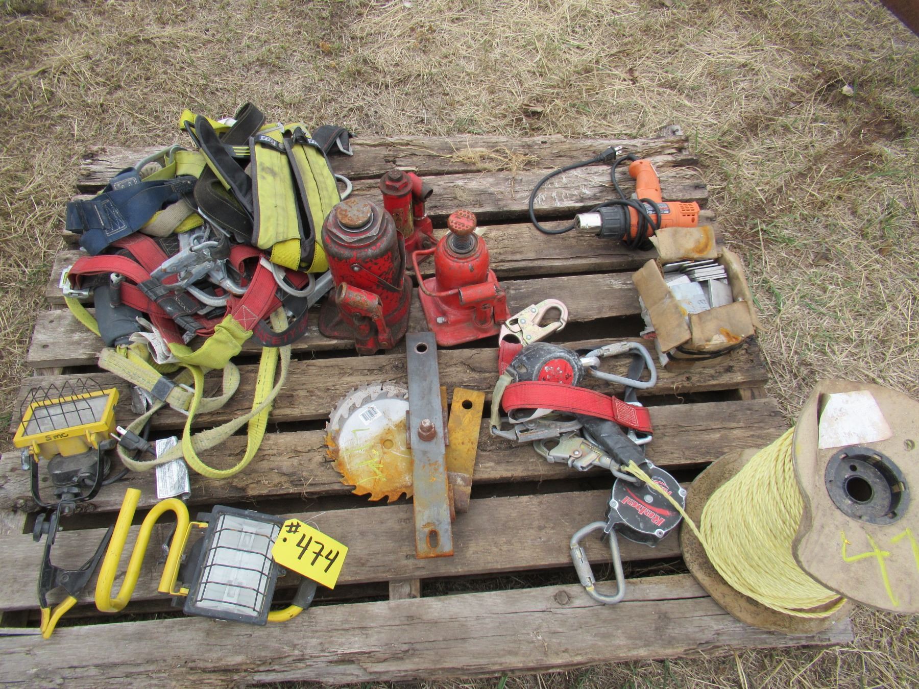 PALLET OF 3 HYDRAULIC JACKS, SAFETY HARNESS, 2 LIGHTS, HEAT GUN, ROPE