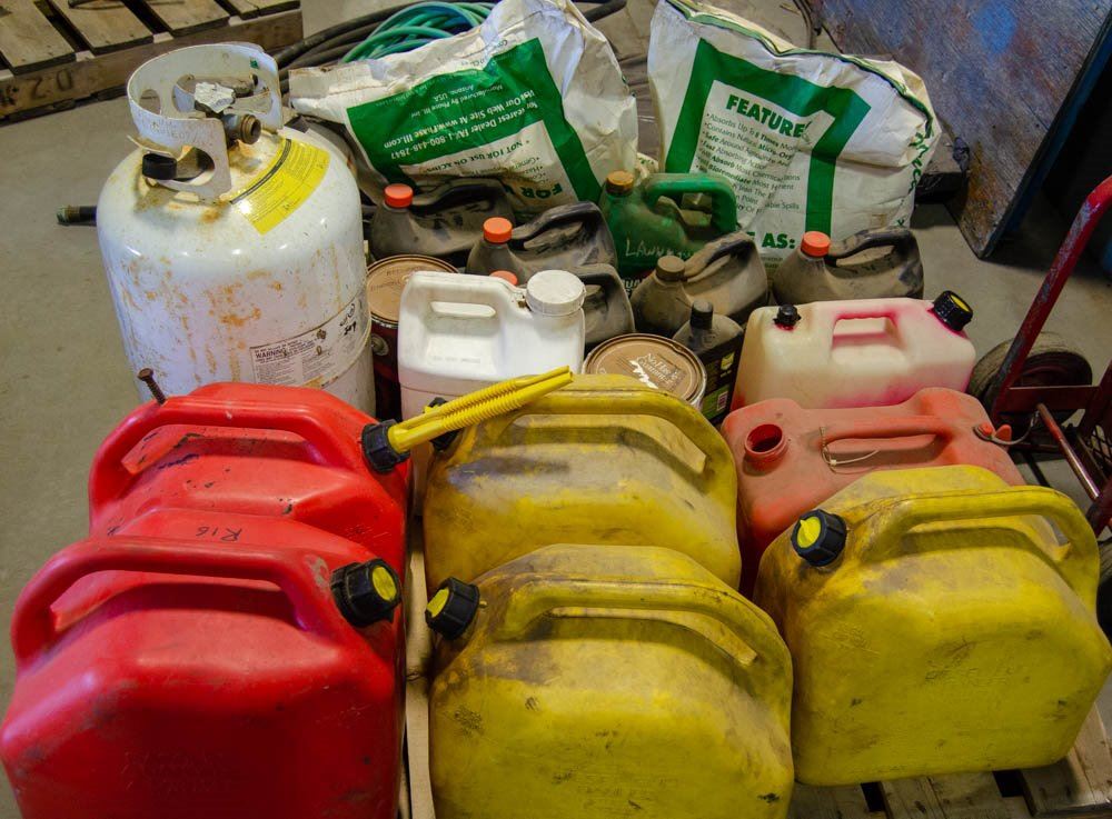 PALLET OF ASSORTED JERRY CANS, PROPANE TANKS,