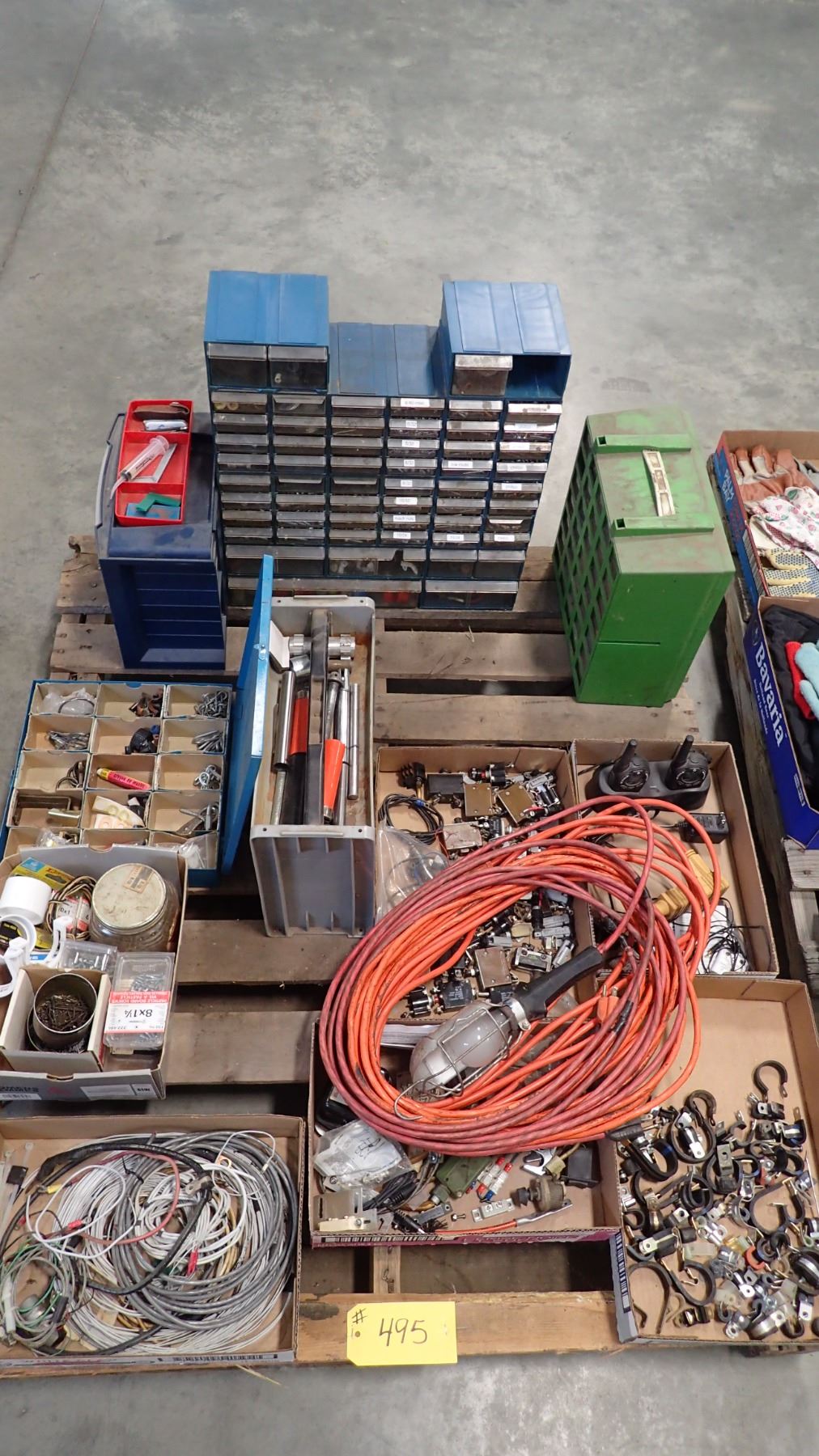 TROUBLE LIGHT, EXTENSION CORD, CLAMPS, VARIOUS AIRCRAFT CIRCUIT BREAKERS, WIRE & PROXIMITY SWITCHES, ASSORTED SCREWS, 2 HAND HELD RADIOS ETC.
