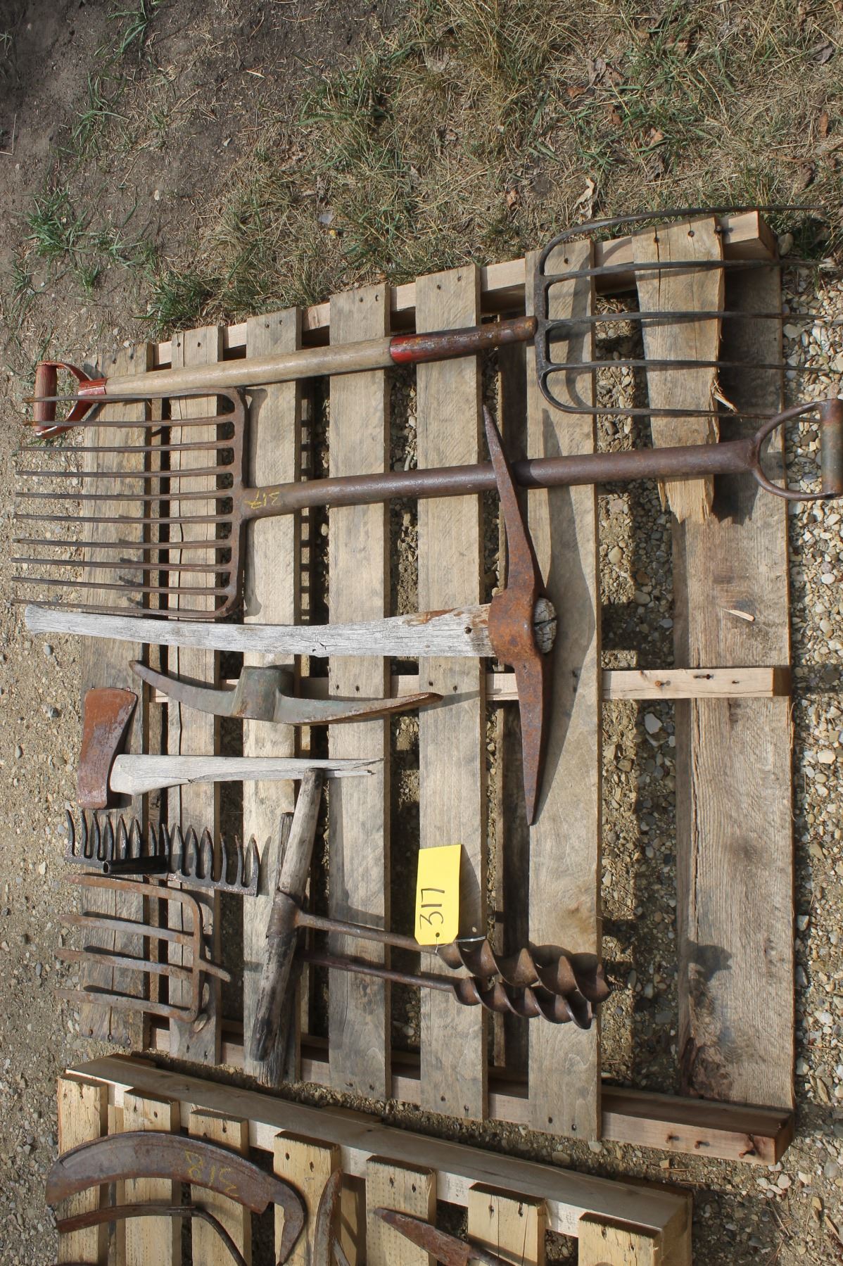 PALLET W/FORKS, AXES, PICKS, RAKES & MISC.