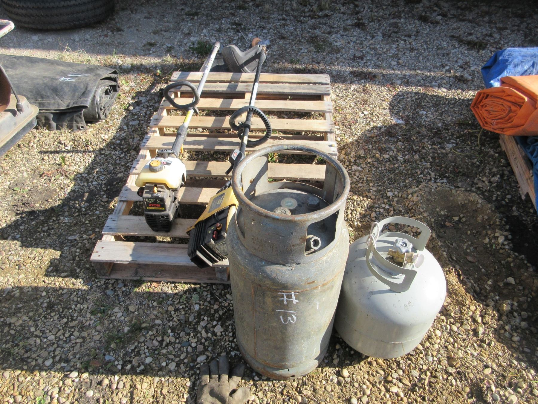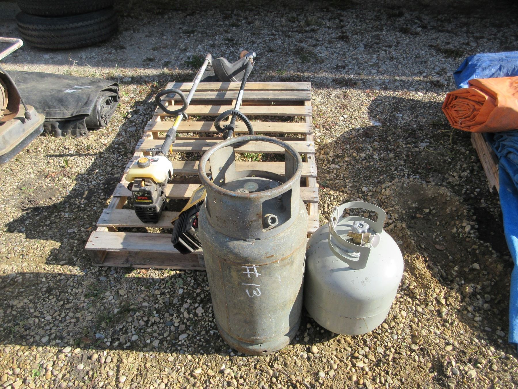 PALLET WITH 2 PROPANE TANKS & 2 GAS WEED EATERS