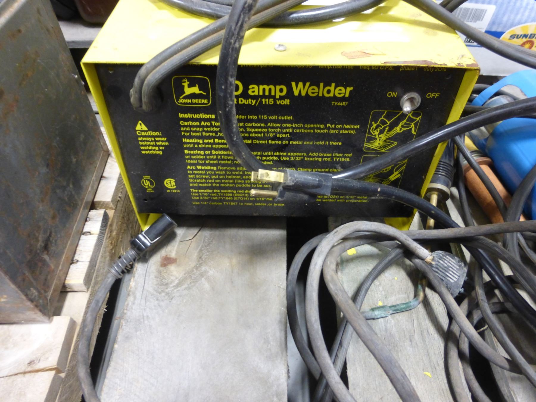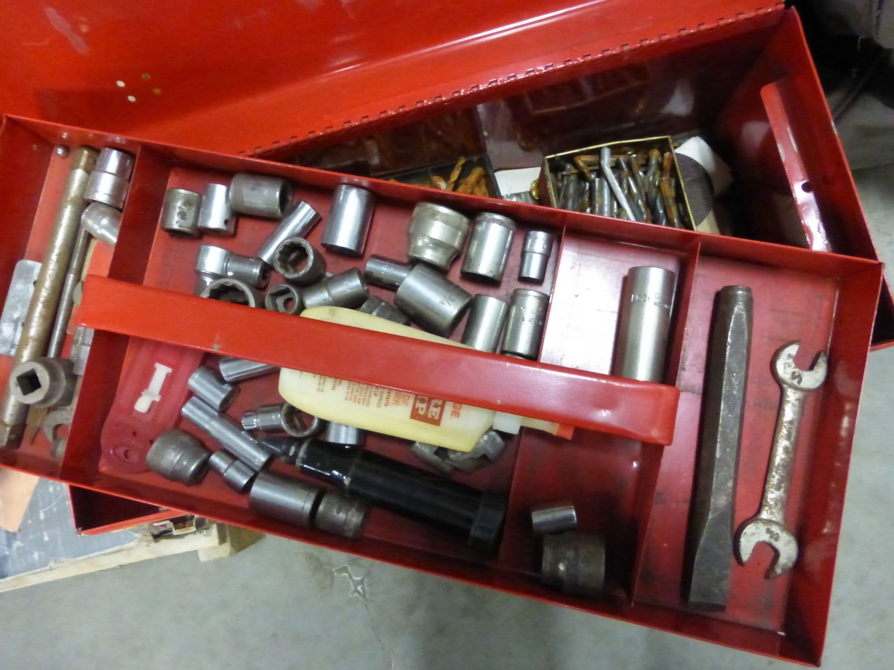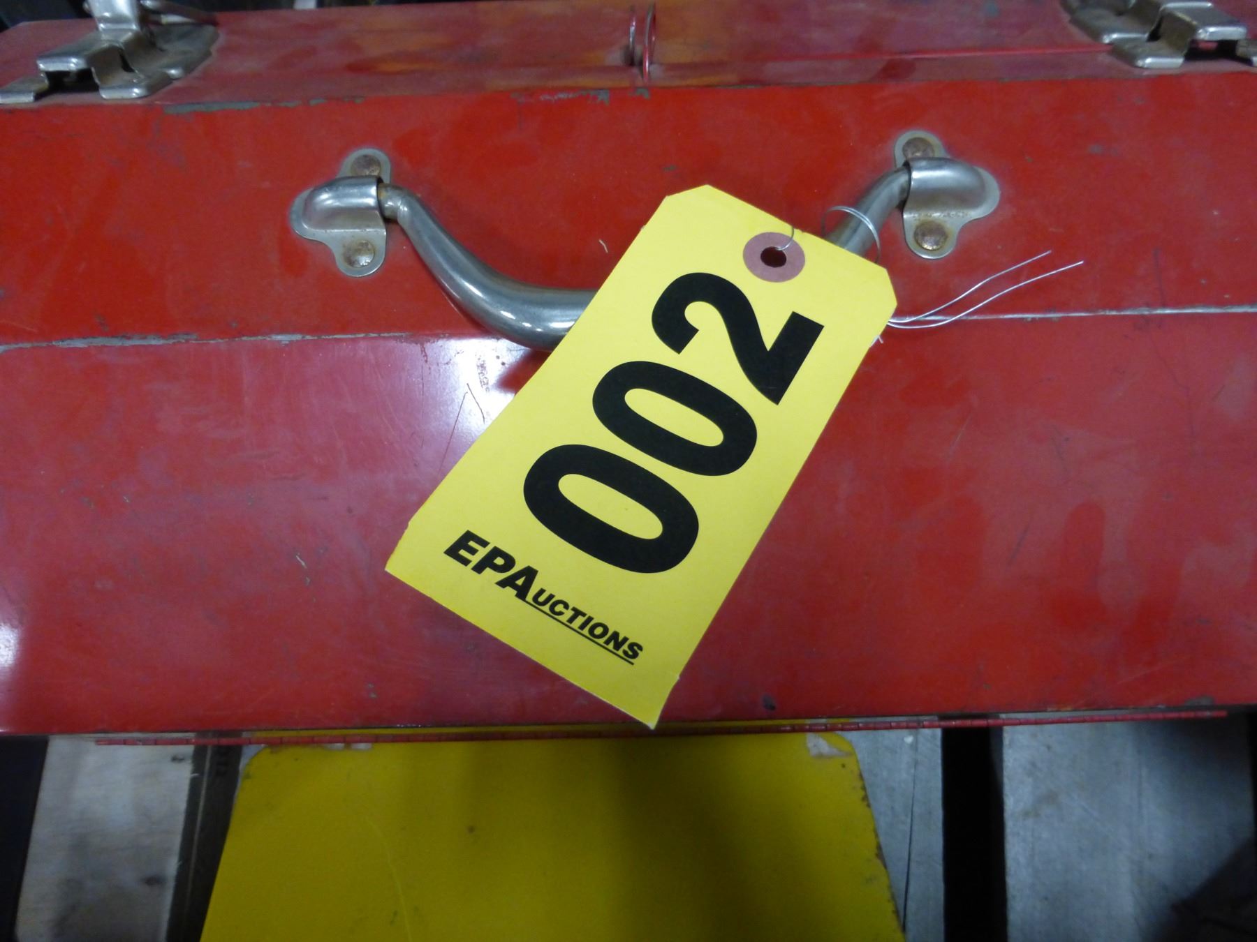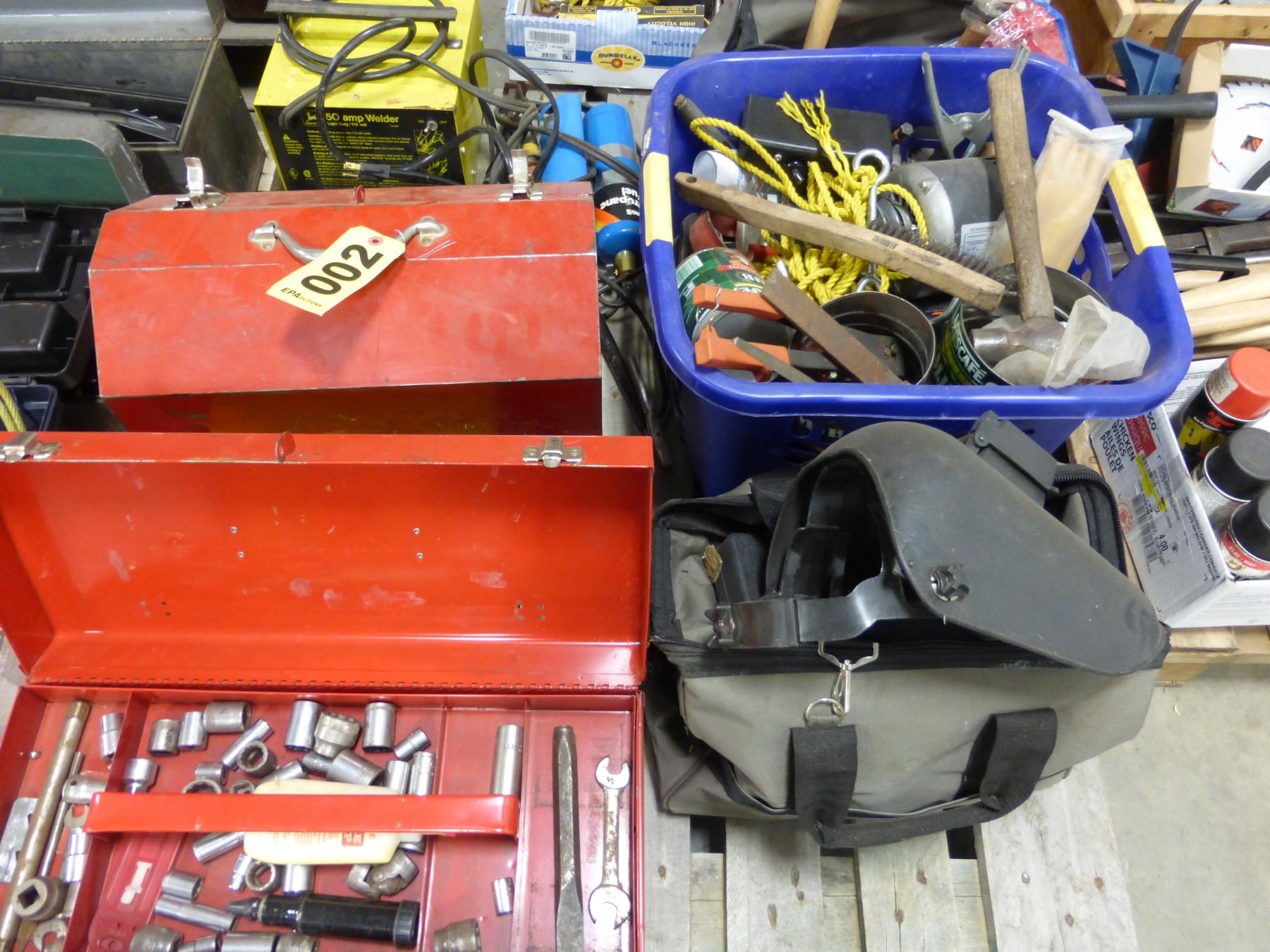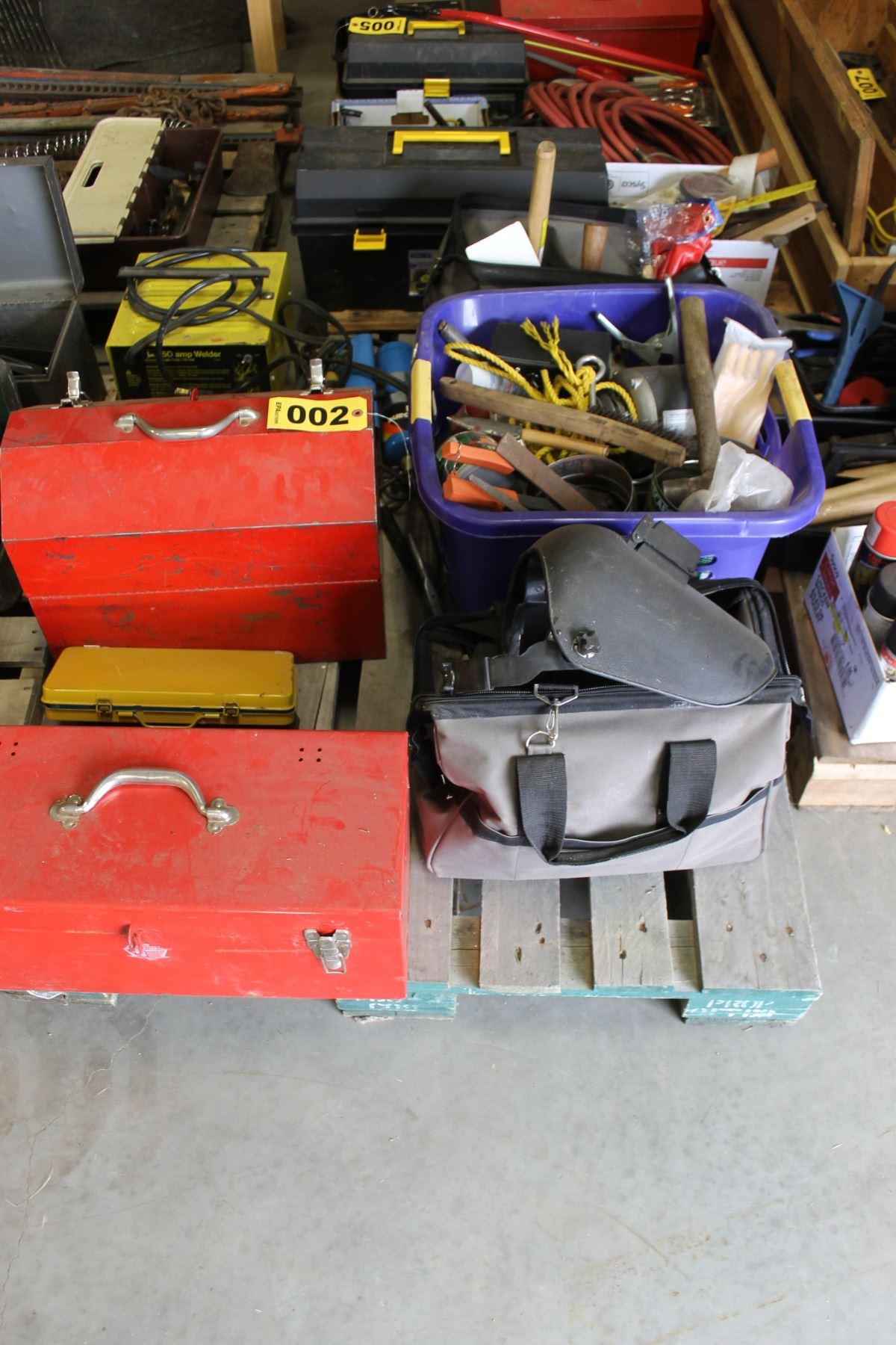 PALLET WITH 2 RED TOOLBOXES & CONTENTS, 50 AMP WELDER, HAMMERS, PROPANE TORCHES, ETC