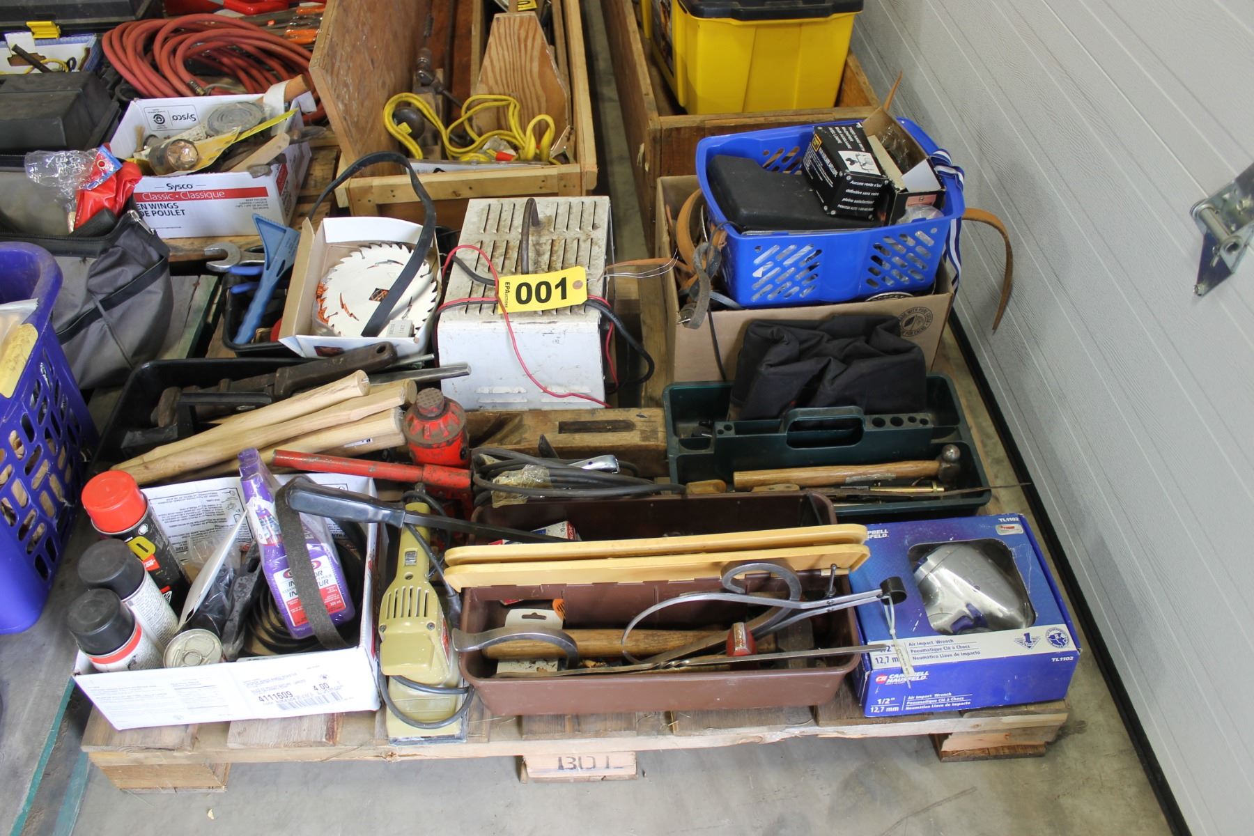 PALLET WITH CHARGER, JACK, SANDER, SAW, AIR IMPACT, PIPE WRENCH, ETC