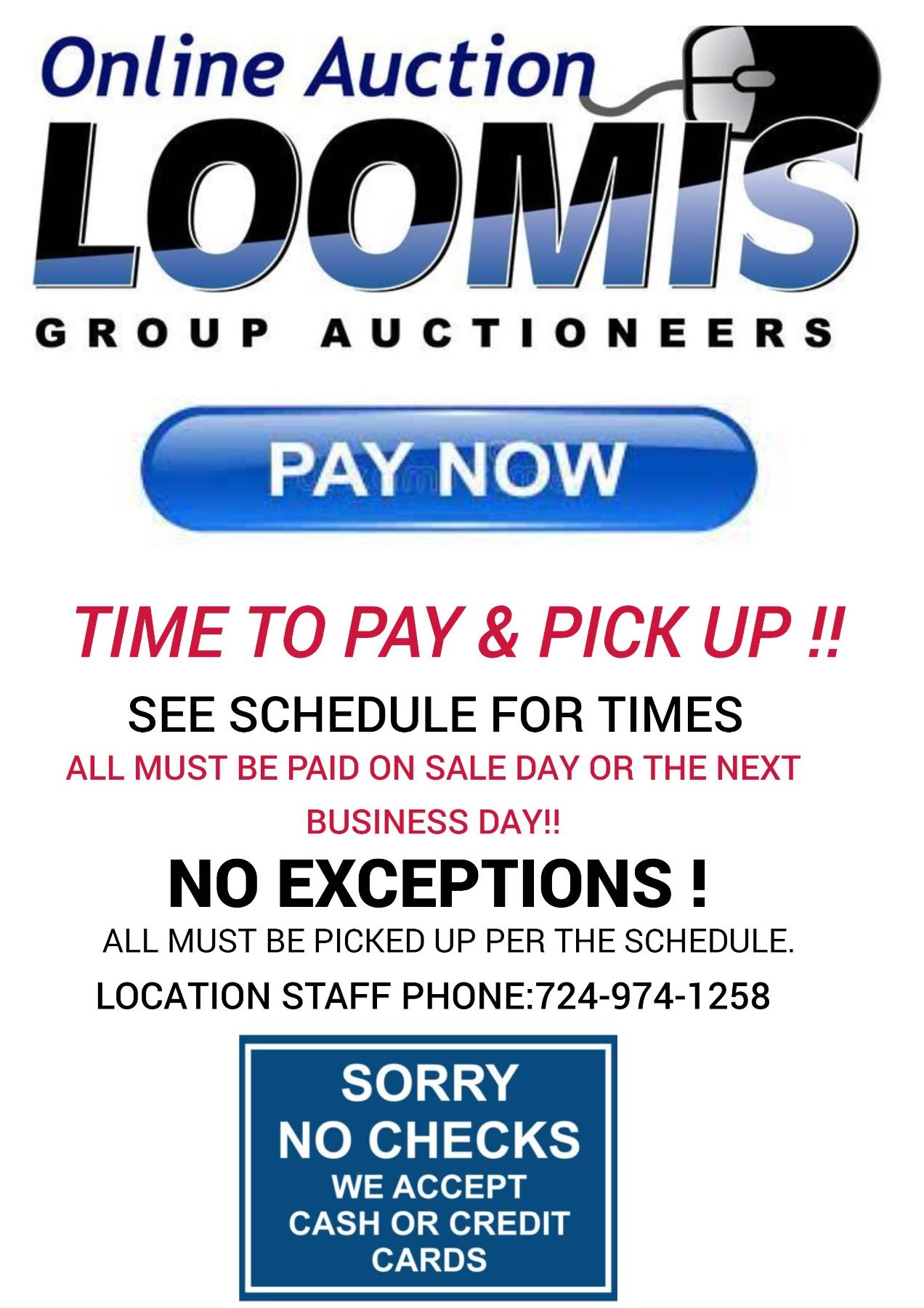 Payment Terms: 100% payment on sale days. Cash, certified checks, company checks only with letter of guarantee from bank, credit card, (4.5% Additional processing fee added to all credit card transactions). All checks require a credit card back up. All items sold AS-IS. Auction company assumes no warranty or liability of any kind, whatsoever. Each buyer is responsible for their items or lots after bought. No reimbursements of any kind. *Real estate payment terms may vary. Location Auctions, all lots paid in full on sale day. Internet auctions, all lots paid in full via credit card sale day. Or credit credit card back up pre-auction and bank wire in full, the next business day. No personal or company checks, whatsoever, unless bank letter of guarantee, and a release for bank to advise Loomis Auctioneers Inc. if there are sufficient funds in the account. Real Estate deposits and buyer’s premium payments CAN NOT exceed 3 business days.