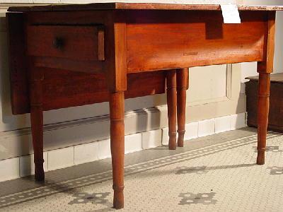 , with deep apron, two drawers, fine turned legs (one is a gate-leg), all original including the salmon paint, circa early to mid 19th C, 29 ½" height x 44 ¾" deep x 28" long with a 17" drop leaf. (45" when extended, virtually square).