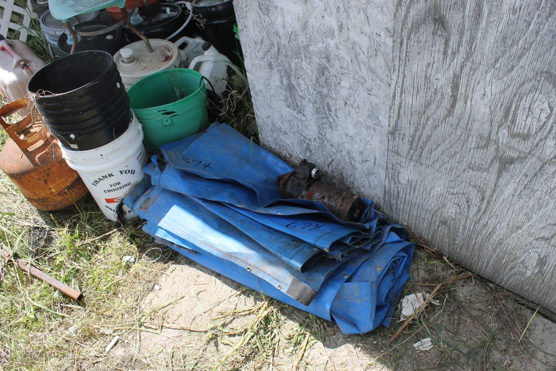 PILE OF BLUE TARPS