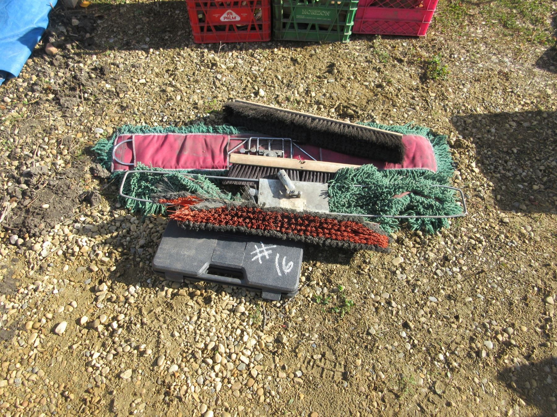 PILE OF MISC TOOLS & BROOMS