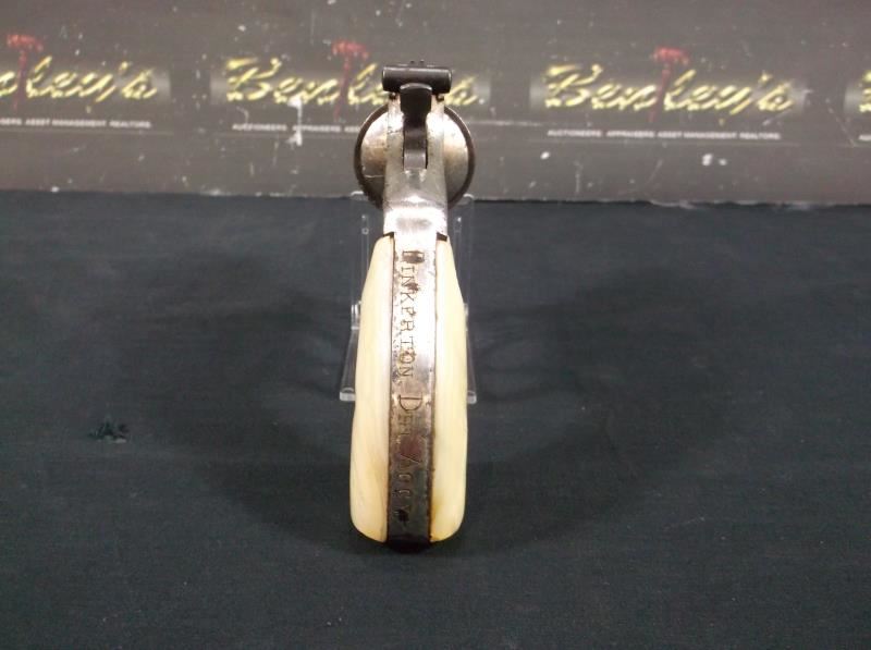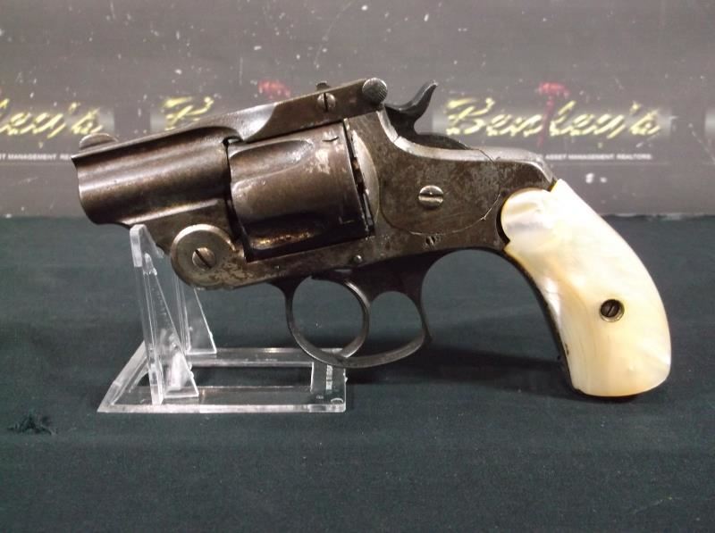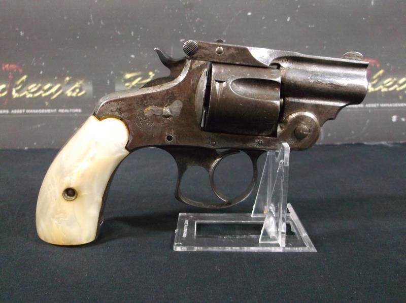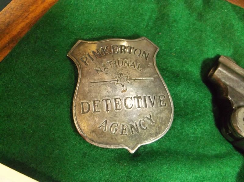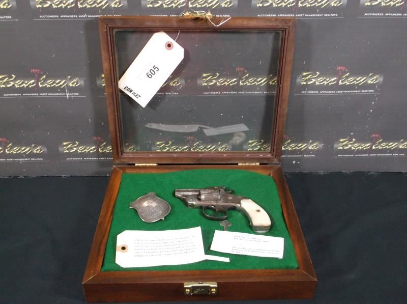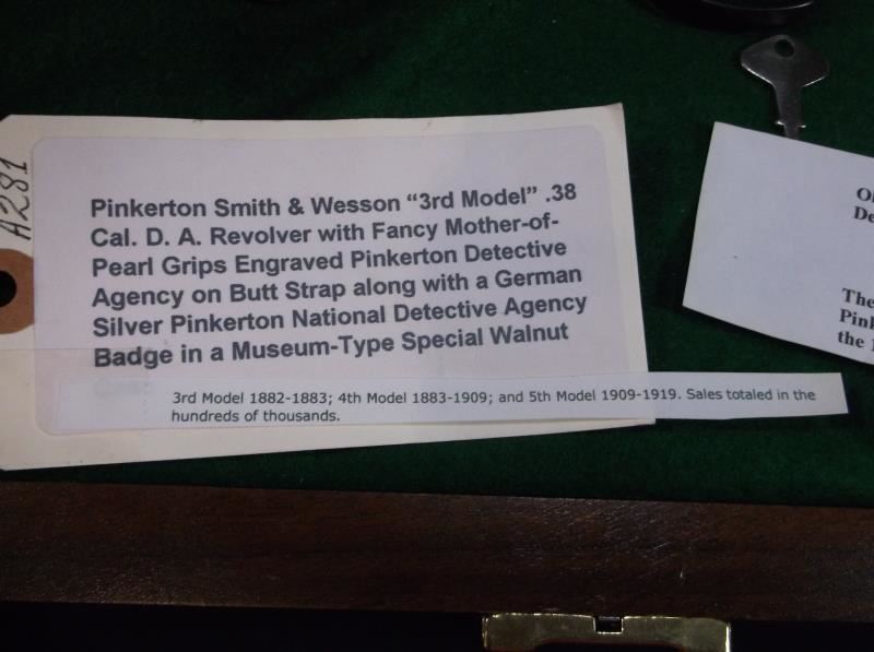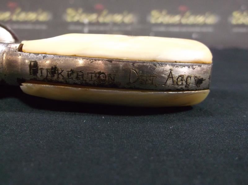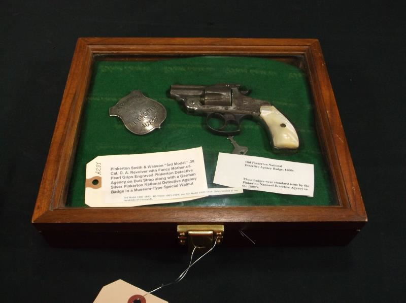 PINKERTON SMITH & WESSON 38 CAL, D.A. REVOLVER, 3RD MODEL,MOTHER OF PEARL GRIP, ENGRAVED PINKERTON DETECTIVE AGENCY, PINKERTON NATIONAL DETECTIVE BADGE IN CASE, S/N: 359288
