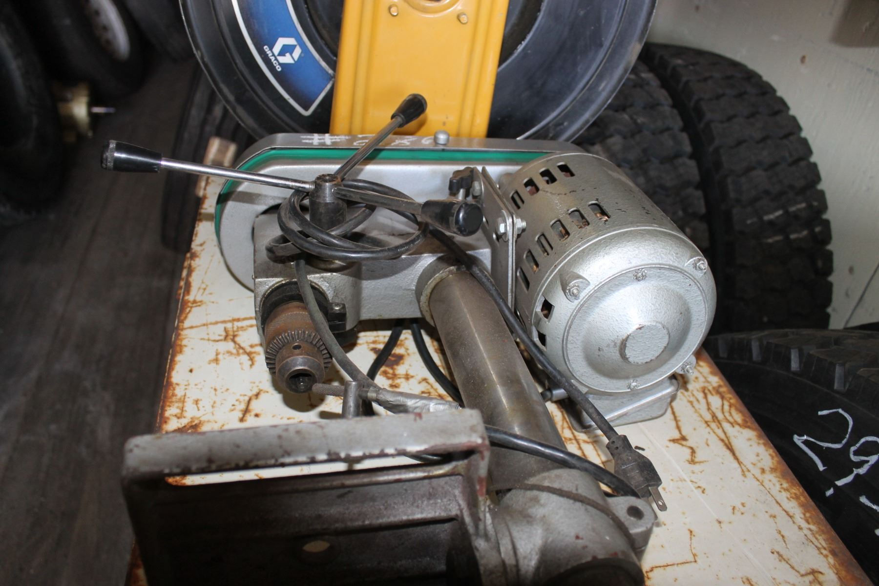 PRESS DRILL, CORDS, COVERALLS, WHITE CABINET & HOSE REEL