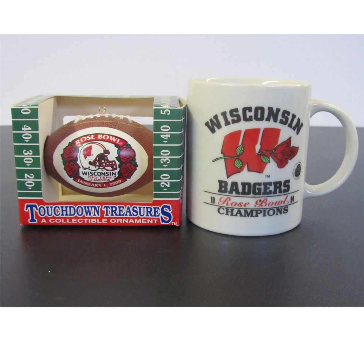 Pair Of Wisconsin Badger Collectibles. A Touchdown Treasures Rose Bowl Football Ornament 2000, and a 1994 Rose Bowl Coffee Mug.