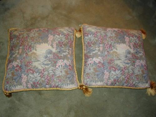 Pair Tapestry Upholstered Pillows with Gold Tassels; 18" x 19"