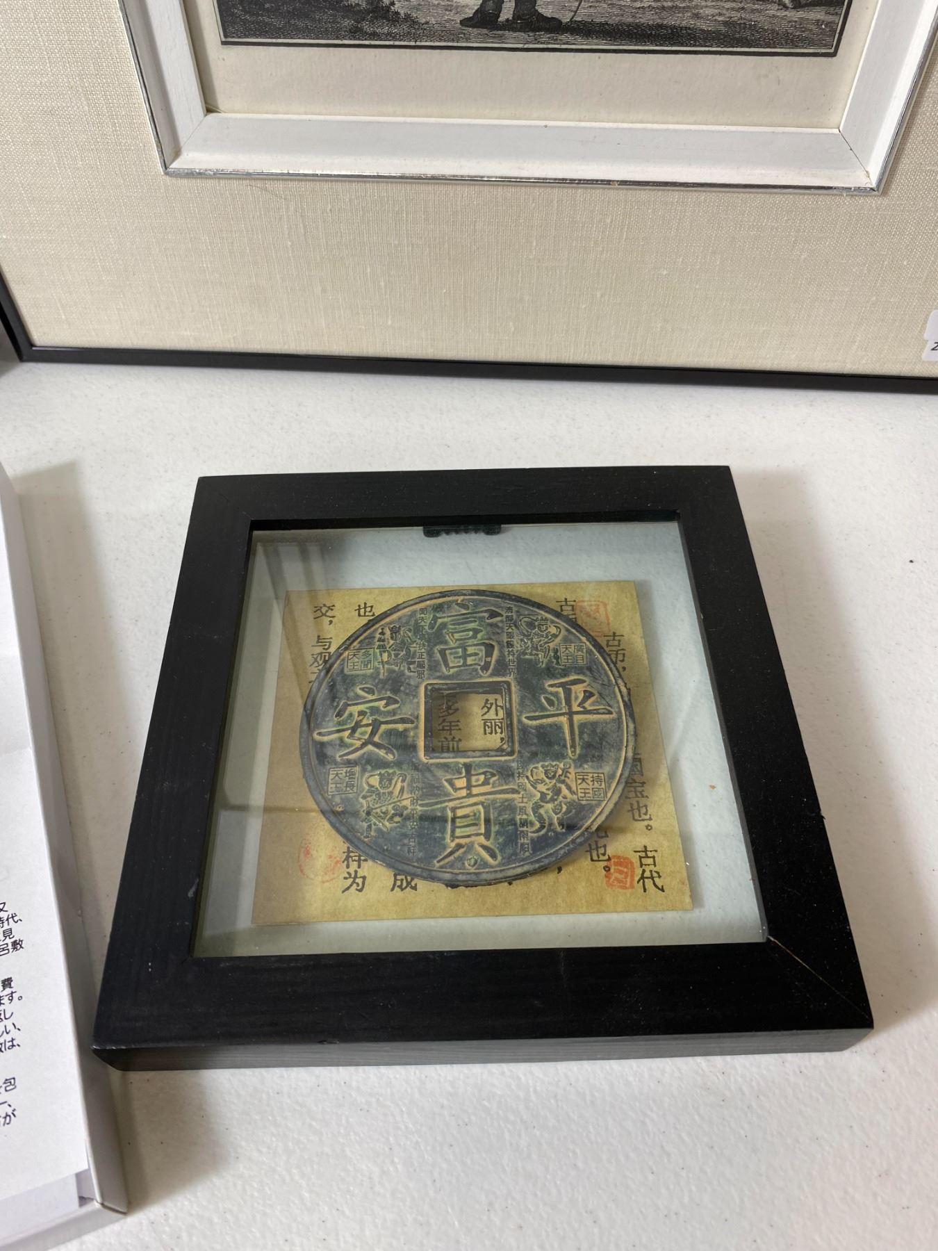 Attractive lot featuring two framed historic engravings along with an embroidered Asian textile and a framed medallion display piece. A diverse grouping suitable for collectors, decorators, or resale. A great addition for collectors or resale.