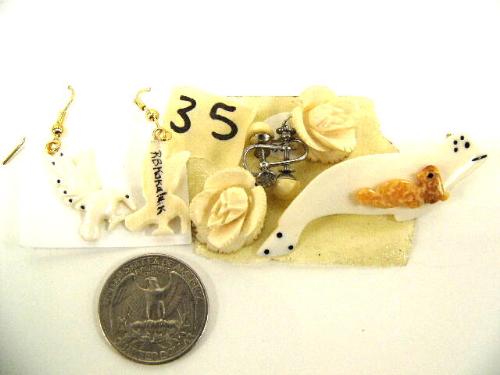 Pair of cormorant ivory earrings, carved floral earrings and ivory seal pin (2)