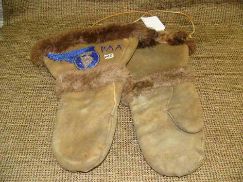 Pair of moose hide mittens, with beaded Pacific Alaska Airways Emblem, lined with otter min. bid $400.00 (74)