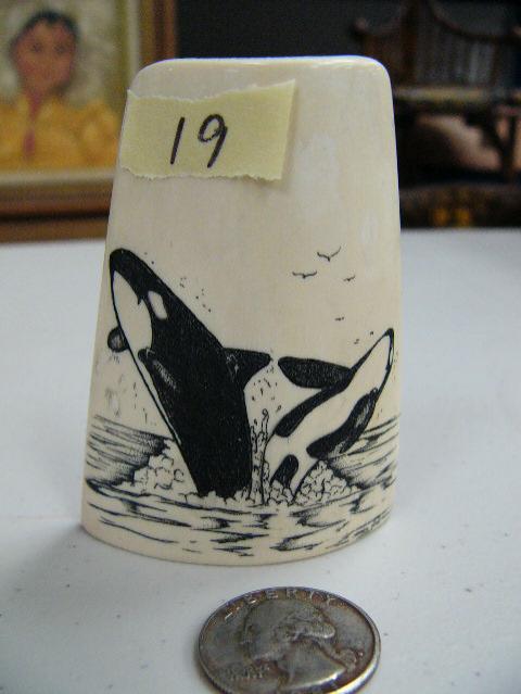 Pair of scrimshawed killer whales jumping by Homer Cole on fossilized ivory (114)