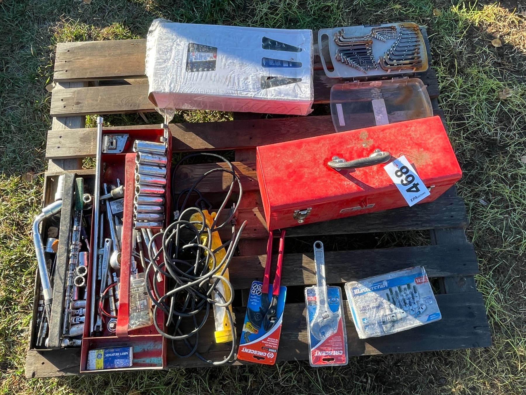 Pallet of Tools, sockets, 2 crescents, tool box, 7pc Mastercraft combination wrench set, allen wrench set