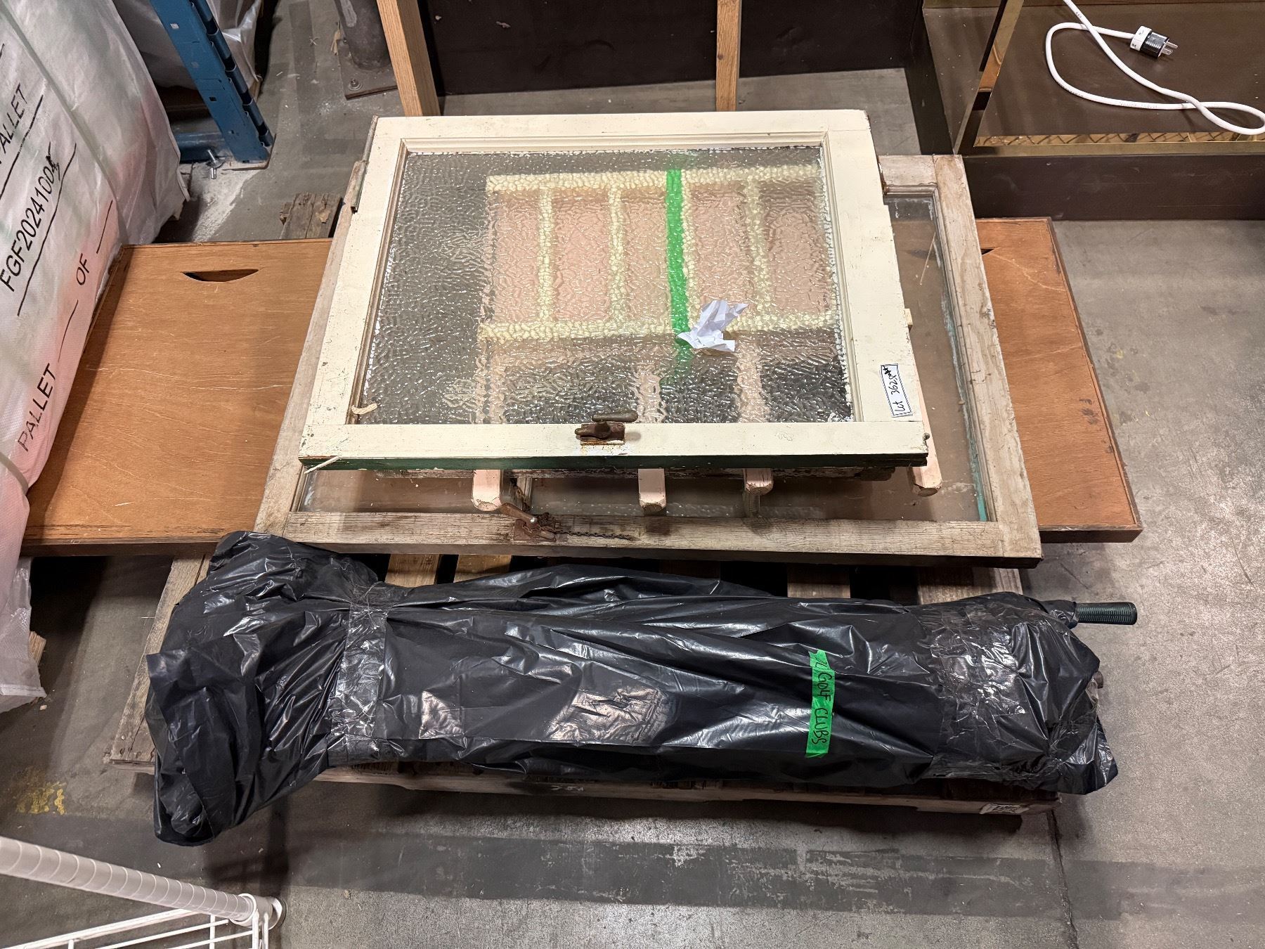 Pallet of assorted estate items - includes vintage glass windows / golf clubs / painting etc