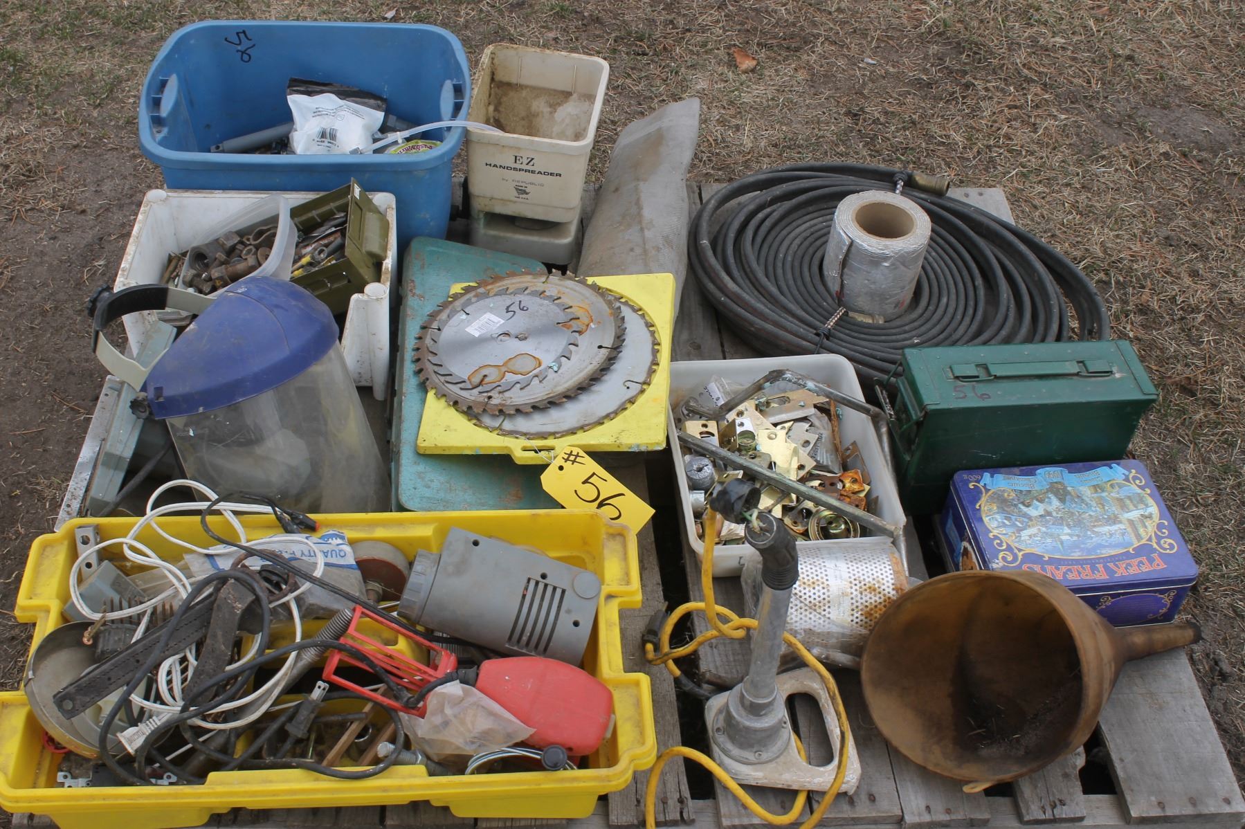 Pallet of misc. plumbing, face shield, saw blades and garden hose