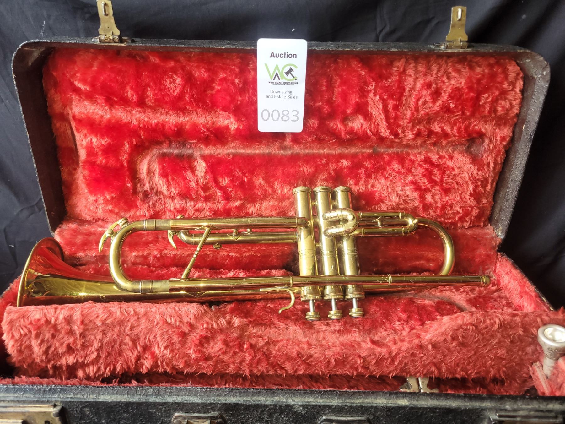 Vintage Brass Trumpet 163854 in antique leather case. Pickup at 10 am