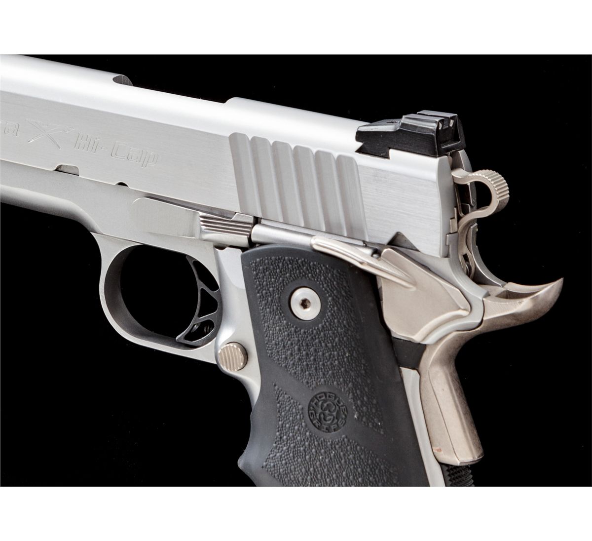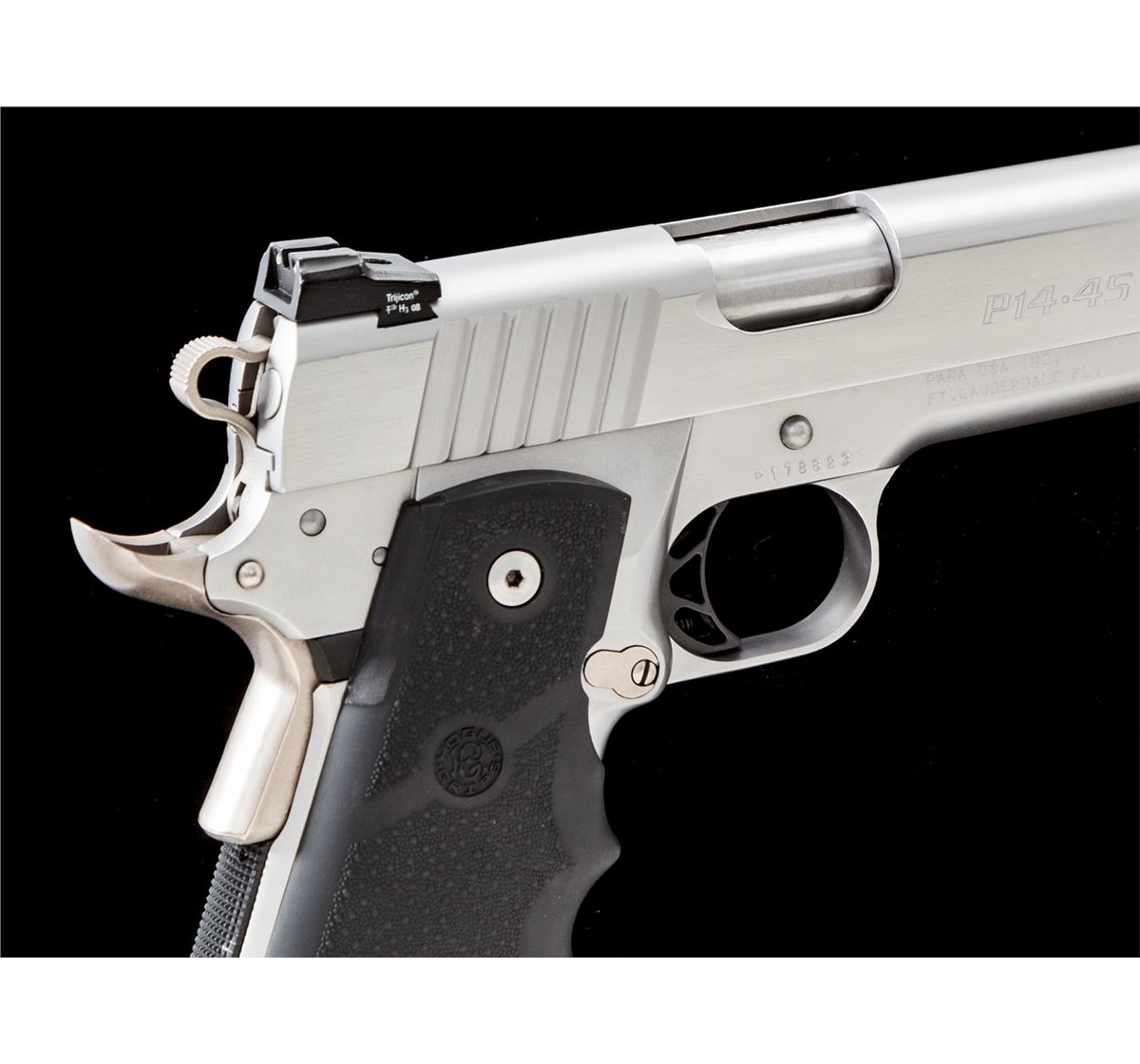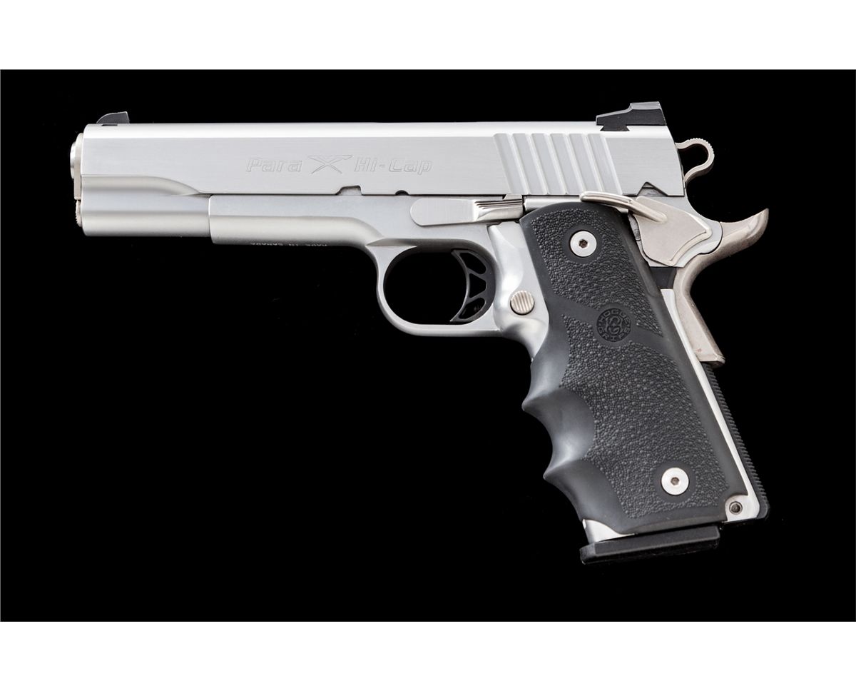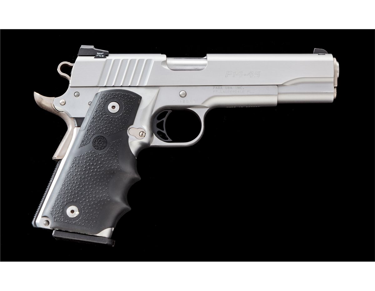Para-Ordnance P14-45 Semi-Automatic Pistol, #P178823, .45 cal., 5'' barrel, stainless steel finish, wraparound fingergroove Hogue rubber grips, Trijicon sights, and although the slide is marked ''Para/Hi-Cap'', pistol is complete with two ten-round magazines. Condition is excellent showing only light marks from handling. Est.: $1,200-$1,800. (Modern)