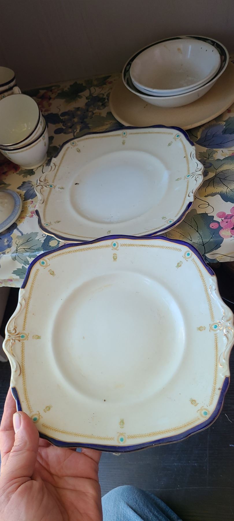 Assortment of antique Paragon cup & saucers, 2 have very fine cracks, 3 cake/sandwich plates, cream & sugar bowl. Chinese rice grain teapot & double handled, lidded tea caddy, cream and sugar. Bring packing and pickup at 9 am