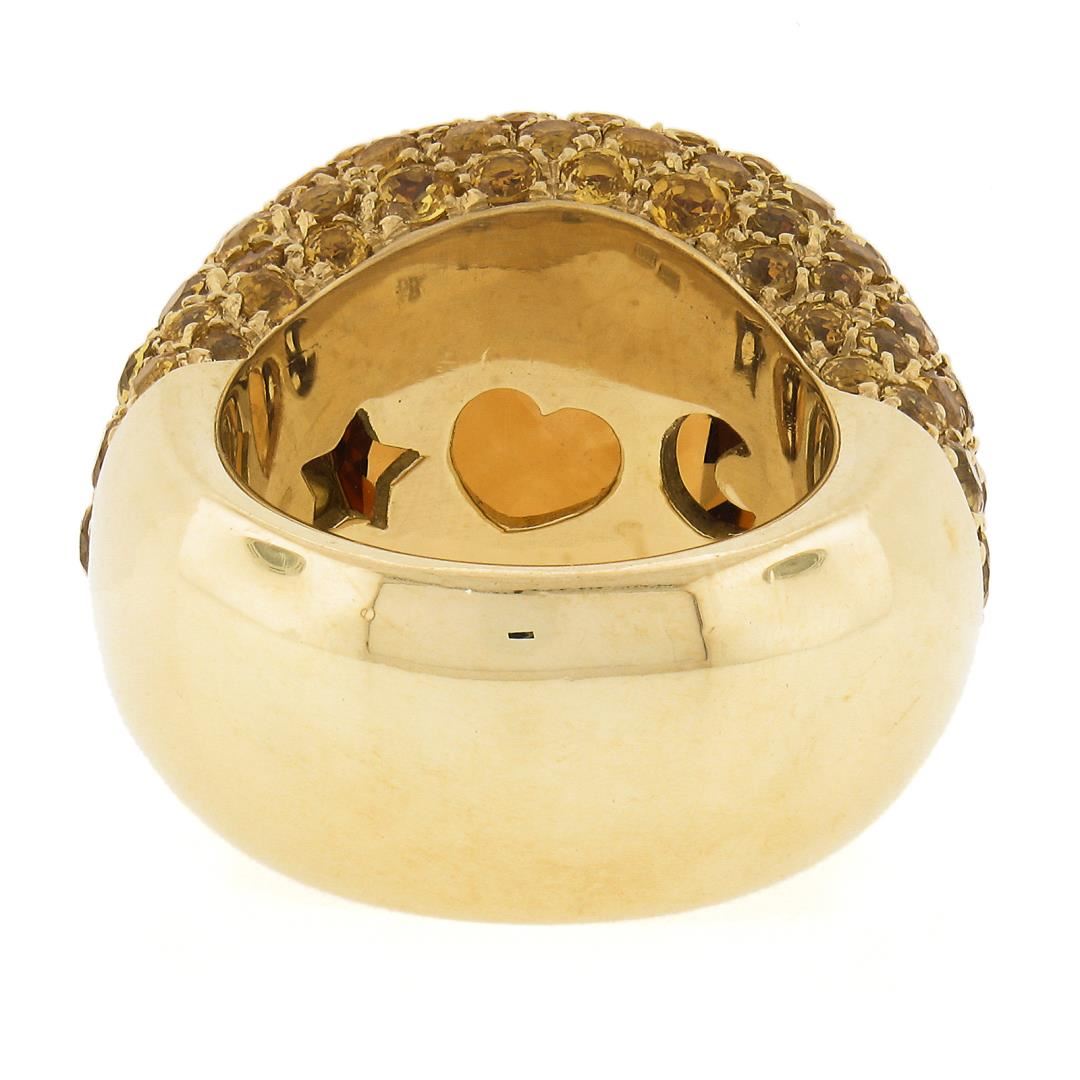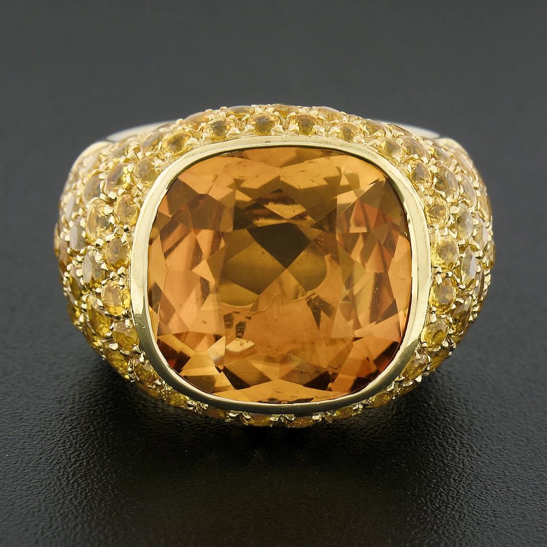 A solid 18k yellow gold cocktail ring by Pasqual Bruni, with 1 Large cushion cut natural citrine (10ct), and numerous of round cut natural yellow sapphires (5-6ctw). The ring is size 6.0, weighs a total of 24.33 grams, and measures 18.4mm wide.