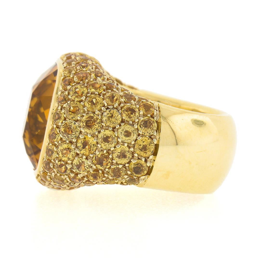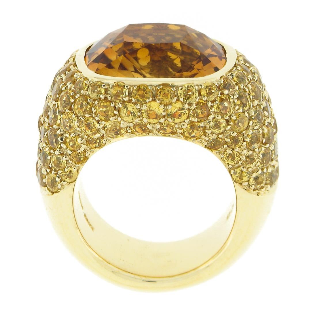 A solid 18k yellow gold cocktail ring by Pasqual Bruni, with 1 Large cushion cut natural citrine (10ct), and numerous of round cut natural yellow sapphires (5-6ctw). The ring is size 6.0, weighs a total of 24.33 grams, and measures 18.4mm wide.