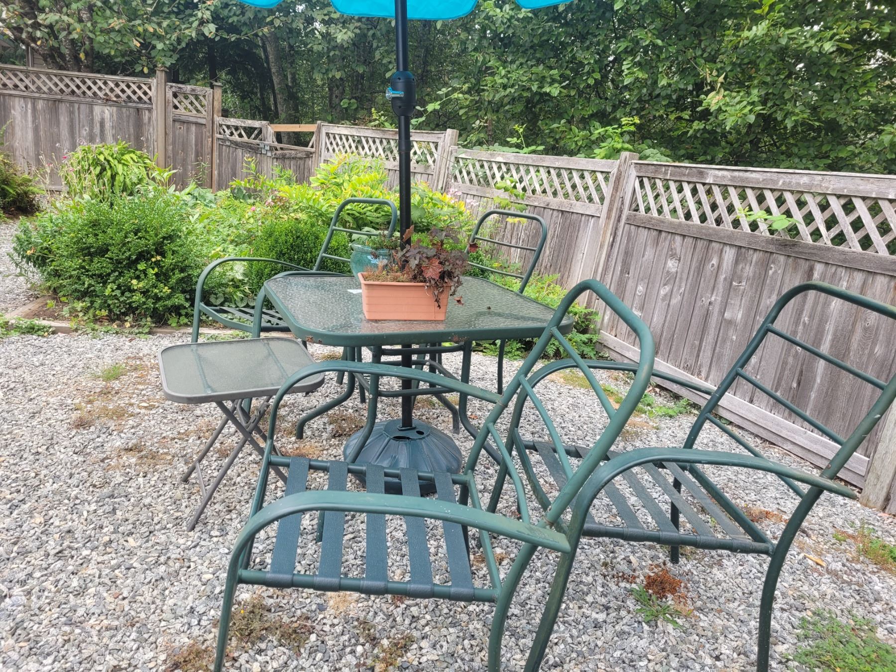 Glass top patio table 36x36x27 with Umbrella and stand. 4 metal chairs and a small table. Pickup at 11 am