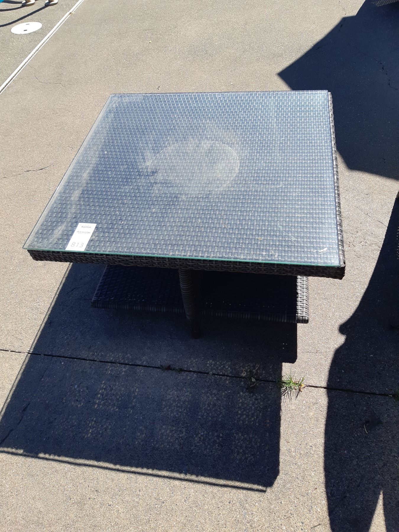 Wicker look patio table, 31x32 x 17, glass top, pickup 10:30am