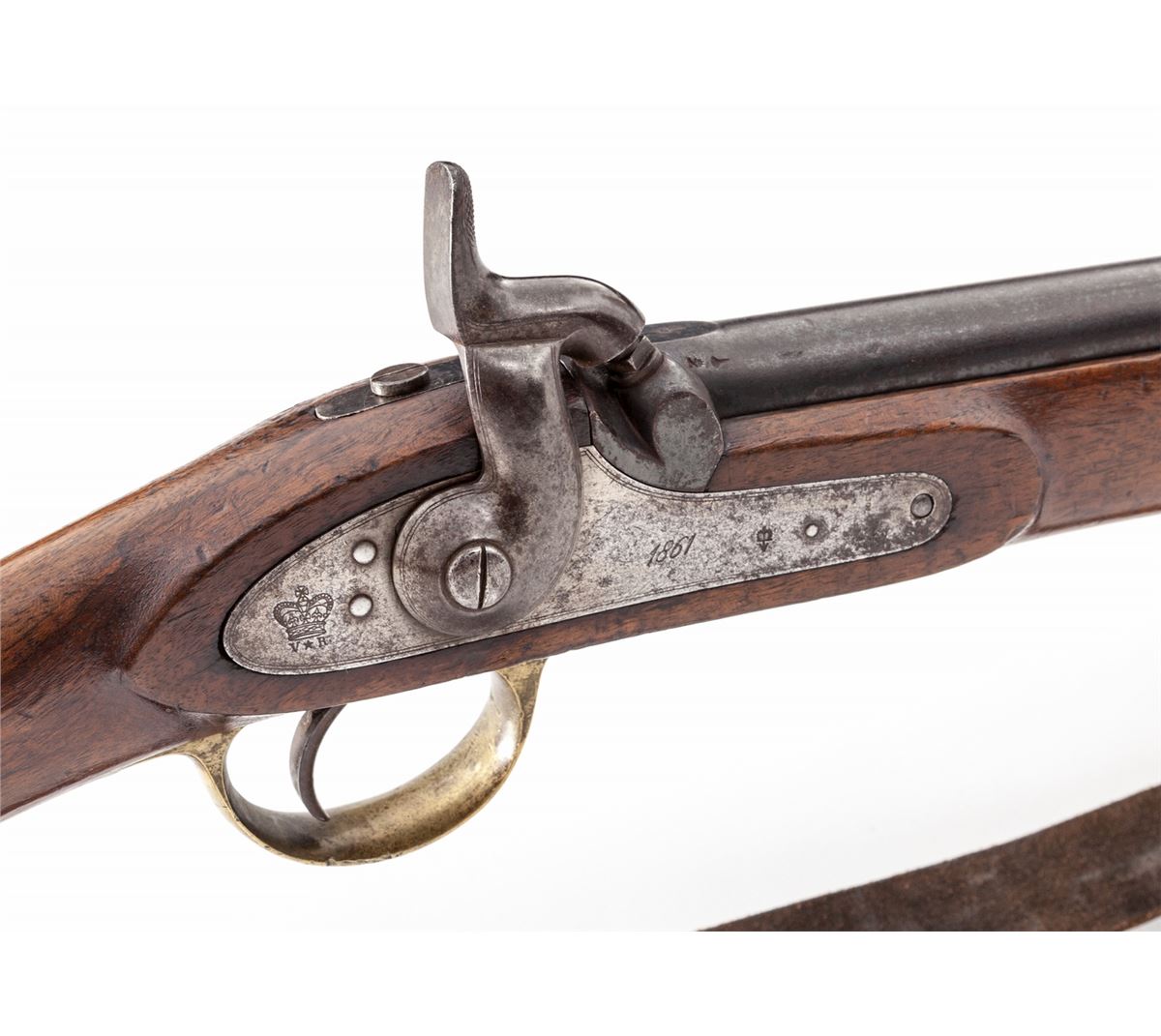 Pattern of 1853 Enfield Artillery Carbine (1861), NVSN, .577 cal., 24'' blue barrel, case hardened lockplate, brass forend cap and buttplate, with 1861 cartouched walnut stock and leather sling. Saber type bayonet lug to right side of barrel. Lockplate with ''(crown)/VR'', no maker's name, with Liege and Belgian proofmarks to barrel. Condition is very good retaining approx. 92% thinning and toning blue to barrel. Carbon spotting to lockplate. Brass triggerguard is missing forward screw. Stock shows light to just moderate scuffs and scratches. Cartouche is crisp. Ramrod is present. Good functioning action, good bore. Est.: $800-$1,200. (Antique)