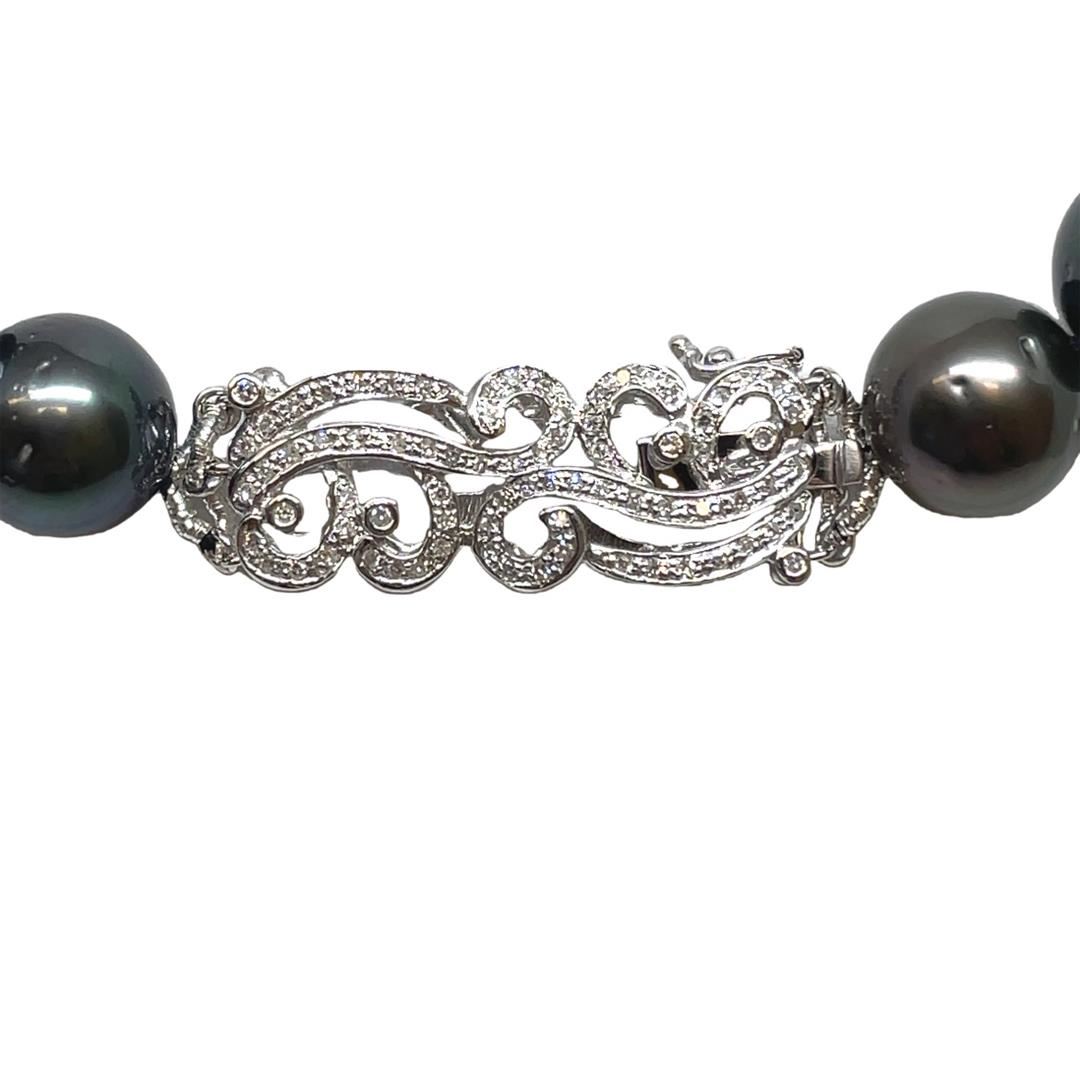 One graduated single strand pearl necklace 18.5" princess length, knotted with a tongue clasp & foldover safety containing 35 Tahitian pearls, 14.0mm to 11.2mm in size. The pearls are black in color, green overtone with a very good luster, round to near round, and moderately blemished with very good matching. The featured pearl necklace has a 14KT white gold swirl motif clasp encrusted with diamonds and four diamond encrusted rondels. Graded on the strand.Tahitian cultured pearls form in the Pinctada Margaritifera oysters. This species is native to the central and South Pacific Ocean but is generally raised in lagoons by pearl farmers. Tahitian cultured pearls take between two to four years to form. Six bezel set single cut diamonds, measuring 1.10 - 1.00 x 0.65mm (depth est.) approximate total weight of 6 Stones = 0.03ct. Graded in the setting. Color H - I Clarity SI-1 to I-1 Cut Good One Hundred Four prong set single cut diamonds, measuring 1.10 - 1.00 x 0.65mm (depth est.) approximate total weight of 104 Stones = 0.45ct. Graded in the setting. Color H - I Clarity SI-1 to I-1 Cut Good Total Weight of Diamonds 0.48ct. Total Weight of 97.30gm