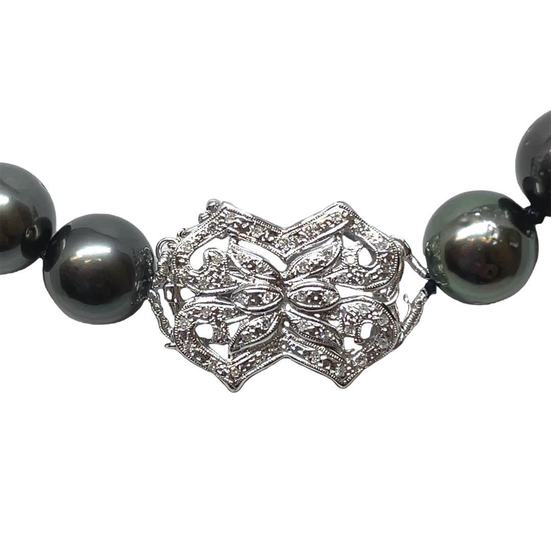 One graduated single strand pearl necklace 18.5" princess length, knotted with a tongue clasp & foldover safety containing 35 Tahitian pearls, 13.8mm to 11.1mm in size. The pearls are black in color, green overtone with a very good luster, round to near round, and lightly blemished with very good matching. The featured pearl necklace has a 14KT white gold bow motif clasp encrusted with diamonds and features 6 diamond encrusted rondels. Graded on the strand.Tahitian cultured pearls form in the Pinctada Margaritifera oysters. This species is native to the central and South Pacific Ocean but is generally raised in lagoons by pearl farmers. Tahitian cultured pearls take between two to four years to form. Forty-Six prong set single cut diamonds, measuring 1.10 - 1.00 x 0.65mm (depth est.) approximate total weight of 46 Stones = 0.20ct. Graded in the setting.Color H - IClarity SI-1 to I-1 Cut Good Thirty-Six bezel set single cut diamonds, measuring 1.20 - 1.10 x 0.71mm (depth est.) approximate total weight of 36 Stones = 0.20ct. Graded in the setting.Color H - IClarity SI-1 to I-1 Cut Good Total Weight of Diamonds 0.40ct. Total Weight of 95.30gm