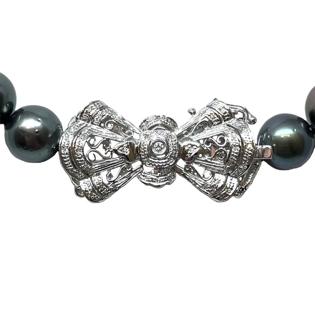 One graduated single strand pearl necklace 18.5" princess length, knotted with a tongue clasp & foldover safety containing 37 Tahitian pearls, 13.4mm to 10.2mm in size. The pearls are black in color, green overtone with a very good luster, round to near round, and mostly clean with very good matching. The featured pearl necklace has a 14KT white gold bow motif clasp encrusted with diamonds. Graded on the strand.Tahitian cultured pearls form in the Pinctada Margaritifera oysters. This species is native to the central and South Pacific Ocean but is generally raised in lagoons by pearl farmers. Tahitian cultured pearls take between two to four years to form. One bezel set round brilliant cut diamond, measuring 2.00 - 2.00 x 1.24mm (depth est.) approximate weight of 0.03ct. Graded in the setting. Color H Clarity VS-2 Cut Very Good Thirty-Two prong set single cut diamonds, measuring 1.20 - 1.10 x 0.71mm (depth est.) approximate total weight of 32 Stones = 0.18ct. Color G - I Clarity SI-1 to I-1 Cut Good Total Weight of Diamonds 0.21ct. Total Weight of 82.90gm