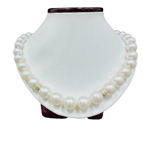 One graduated single strand pearl necklace 18.5" princess length, knotted with a tongue clasp & foldover safety containing 33 south sea cultured pearls, 14.2mm to 12.0mm in size. The pearls are white in color with a good luster, round to near round, and moderately blemished with very good matching. The featured pearl necklace has a 14KT yellow gold oval motif clasp with snap locking foldunder safety, encrusted with diamonds and four diamond set rondels. Graded on the strand.South Sea cultured pearls are farmed in the oceans surrounding Australia, Indonesia, the Philippines and the southern coast of China. The main source of Australian South Sea pearls lies in the northwest on the Kimberly coast. South Sea cultured pearls are formed in the Pinctada Maxima oyster, which is the world's largest pearl cultivating oyster and is native to the South China Sea, the Java, the Indian and the Pacific Oceans. There are two varieties of the Pinctada Maxima oyster: the Gold Lipped oyster which produces golden colored pearls, and the Silver Lipped oyster which produces white colored pearls. These pearls take between two to three years to grow and have a unique nacre due to the fast moving and clean waters of the South Seas. Forty-Seven prong set single cut diamonds, measuring 1.10 - 1.00 x 0.65mm (depth est.) approximate total weight of 47 Stones = 0.20ct. Graded in the setting. Color H - I Clarity SI-2 to I-1 Cut Good Total Weight of Diamonds 0.20ct. Total Weight of 111.30gm