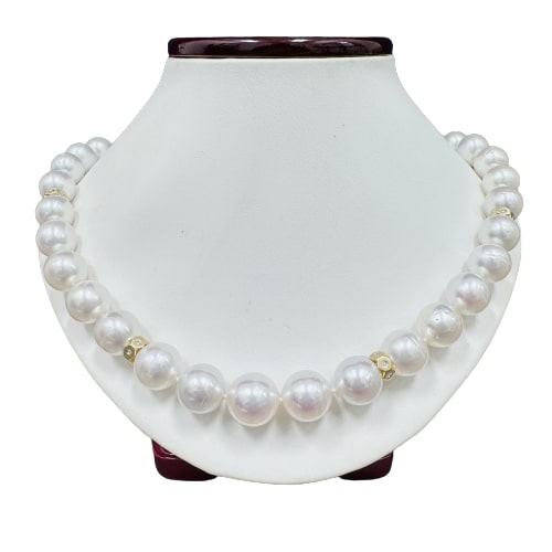 One graduated single strand pearl necklace 18.5" princess length, knotted with a tongue clasp & foldover safety containing 35 south sea cultured pearls, 14.1mm to 11.3mm in size., rosé overtone. The featured pearl necklace has a 14KT yellow gold buckle motif clasp encrusted with diamonds and four diamond set rondels. Graded on the strand.South Sea cultured pearls are farmed in the oceans surrounding Australia, Indonesia, the Philippines and the southern coast of China. The main source of Australian South Sea pearls lies in the northwest on the Kimberly coast. South Sea cultured pearls are formed in the Pinctada Maxima oyster, which is the world's largest pearl cultivating oyster and is native to the South China Sea, the Java, the Indian and the Pacific Oceans. There are two varieties of the Pinctada Maxima oyster: the Gold Lipped oyster which produces golden colored pearls, and the Silver Lipped oyster which produces white colored pearls. These pearls take between two to three years to grow and have a unique nacre due to the fast moving and clean waters of the South Seas. Two bezel set round brilliant cut diamonds, measuring 1.50 - 1.45 x 0.92mm (depth est.) approximate total weight of 2 Stones = 0.03ct. Graded in the setting. Color H Clarity SI-1 Cut Good One Hundred One prong set single cut diamonds, measuring 1.10 - 1.00 x 0.65mm (depth est.) approximate total weight of 101 Stones = 0.45ct. Graded in the setting. Color H - I Clarity SI-1 to I-1 Cut Good Twenty-Four bezel set single cut diamonds, measuring 1.10 - 1.00 x 0.65mm (depth est.) approximate total weight of 24 Stones = 0.10ct. Graded in the setting. Color H - I Clarity SI-1 to I-1 Cut Good Total Weight of Diamonds 0.58ct. Total Weight of 103.40gm