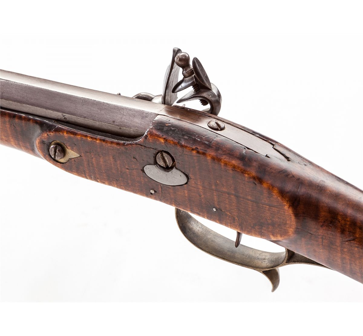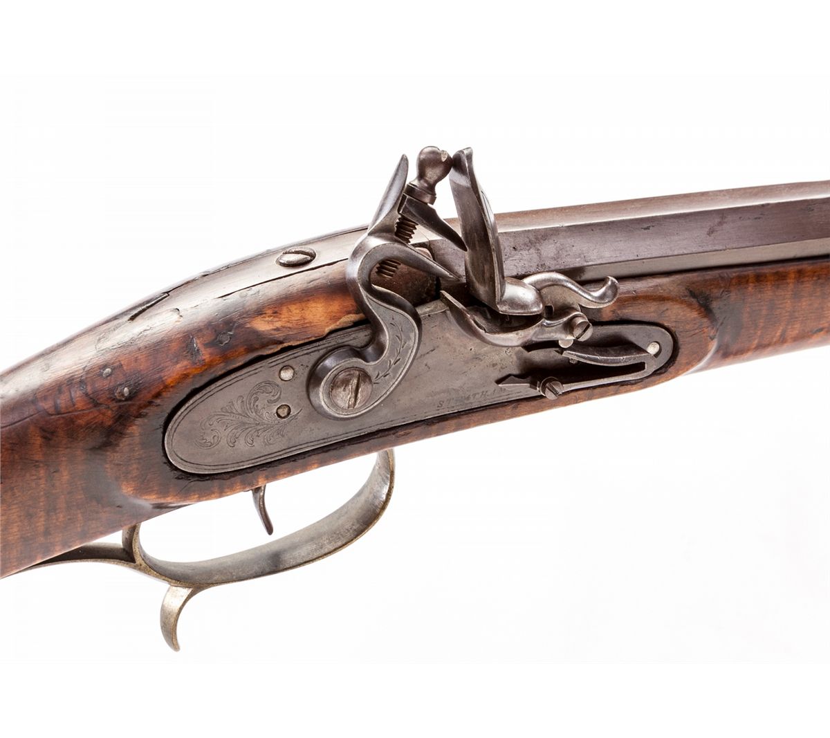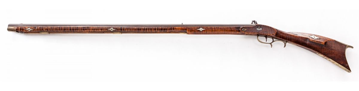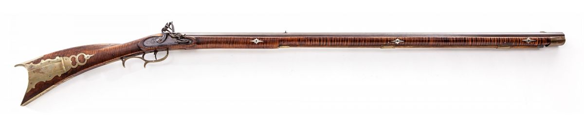 Pennsylvania Flintlock Rifle, marked ''Stratham'', .40 cal., 40-1/4'' octagonal barrel, simple sights, full-length maple stock with hickory ramrod, pierced brass patchbox and hardware, and German silver escutcheons for barrel pins. Condition is very good with even patination to brown barrel and lockplate. Stock has been spliced just forward the rear ramrod flute, with light general marks from handling. Forward two barrel retainer cross pins are missing; brass forend cap fits loosely. Action is good. Est.: $1,200-$1,800. (Antique)