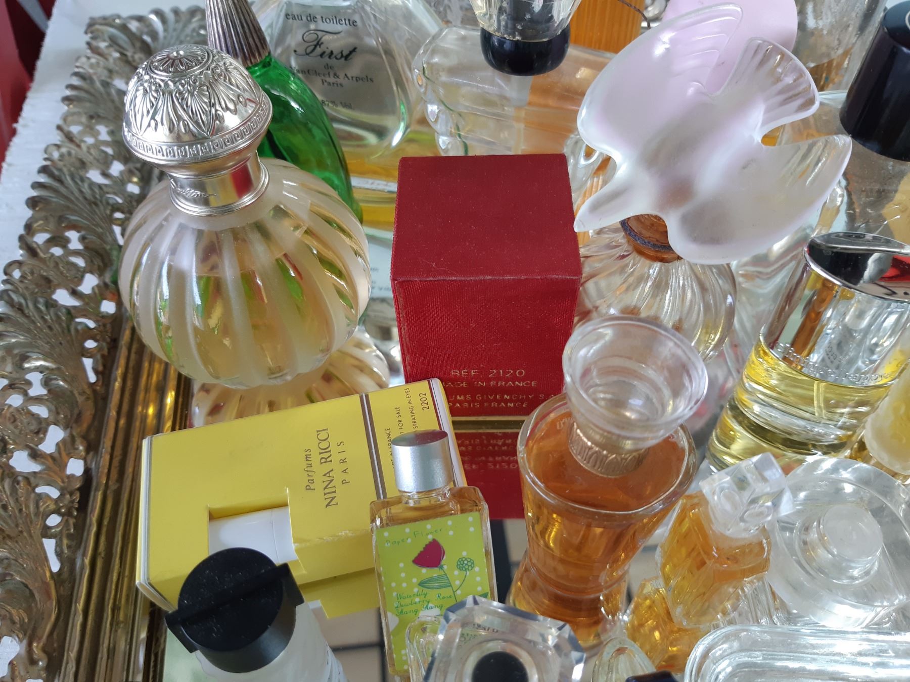 Assortment of designer perfume bottles on 15" mirrored tray. Bring packing supplies and pickup at 10 am