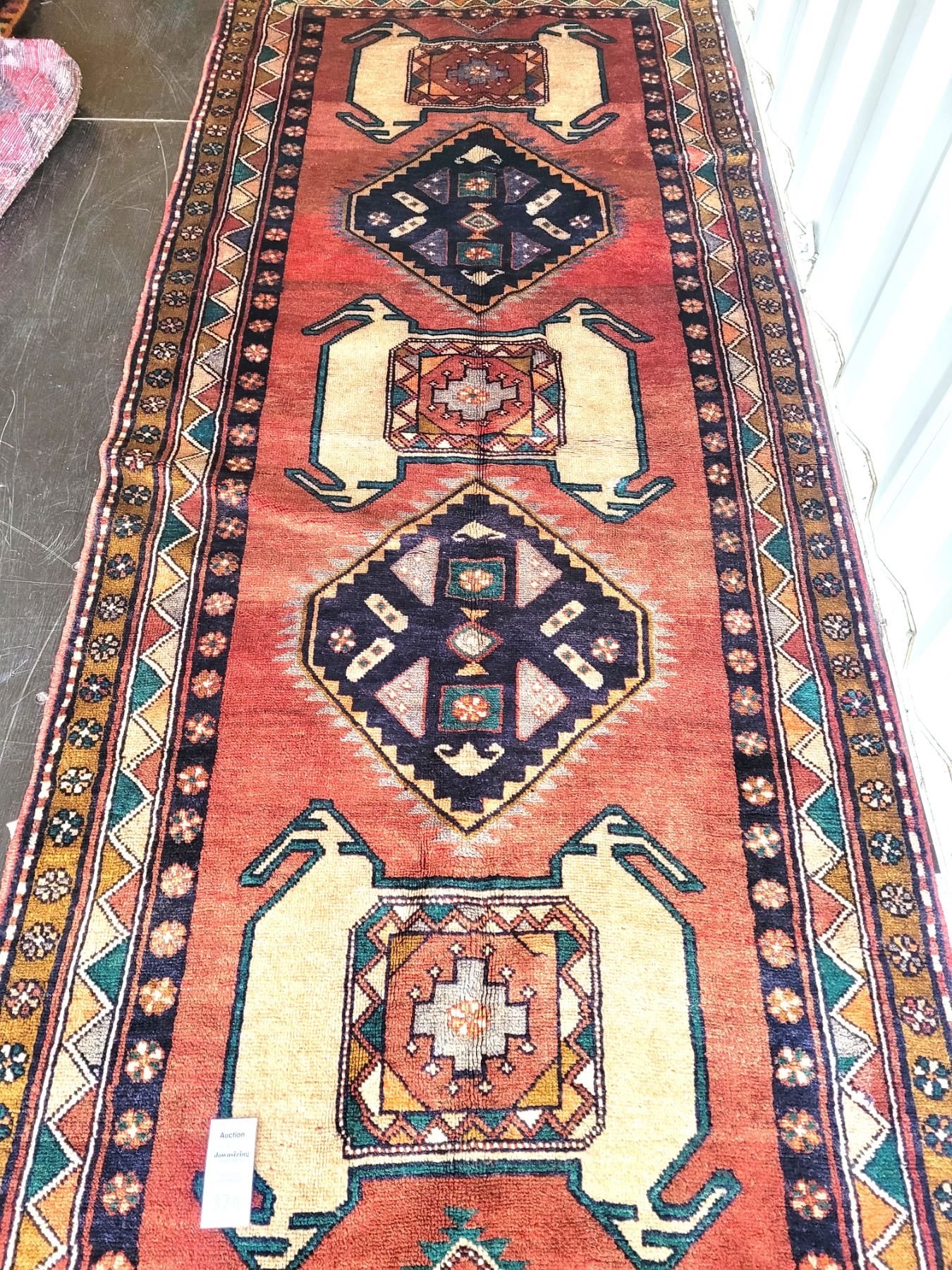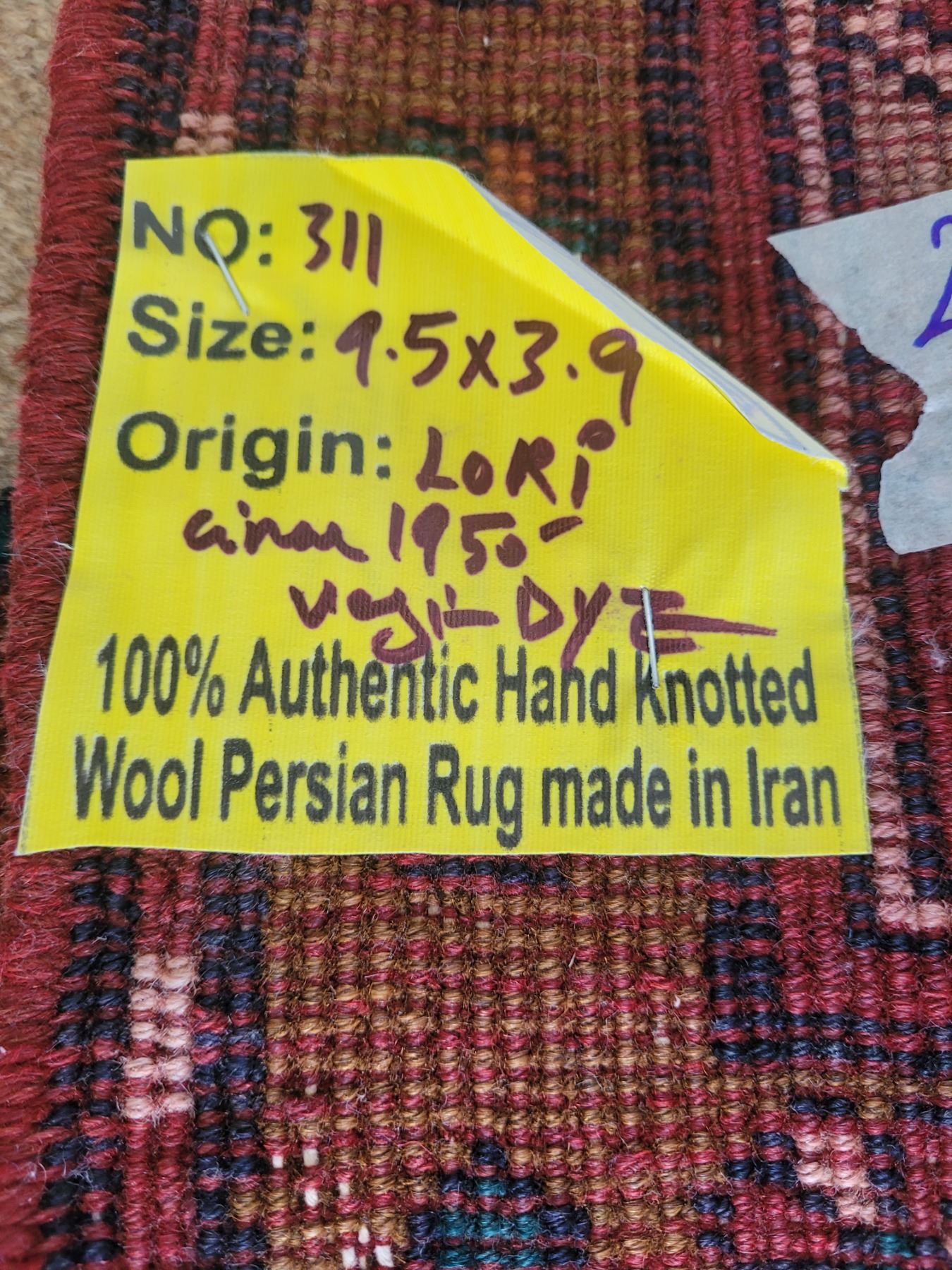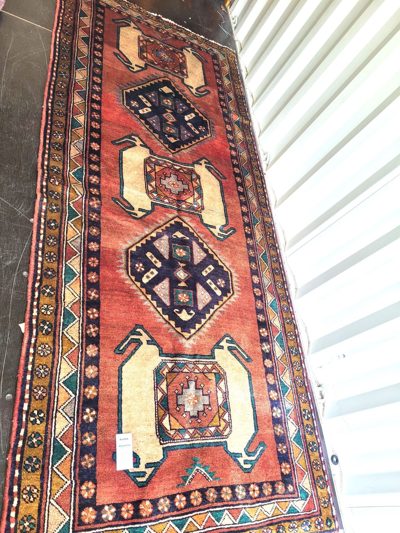 9'5' x 3'9" c 1950's veg dye. Hand knotted wool rug. Pickup at 11 am