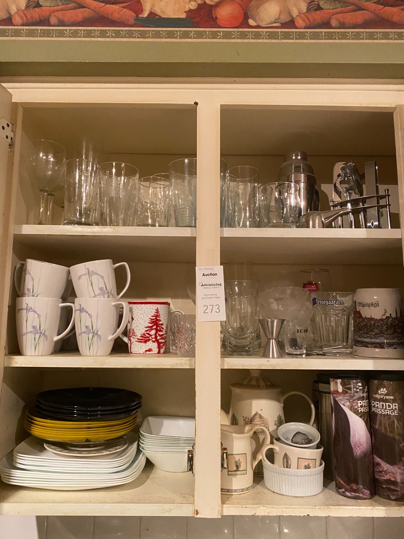 3 Shelves of dinnerware, Pfaltzgraff coffee pot cream & sugar. Corelle dishes, drinking glasses and more. Pickup at 9 am