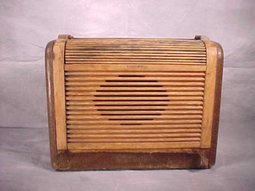 Philco Art Deco table radio w/rolled top & leather. 12.5x5x10