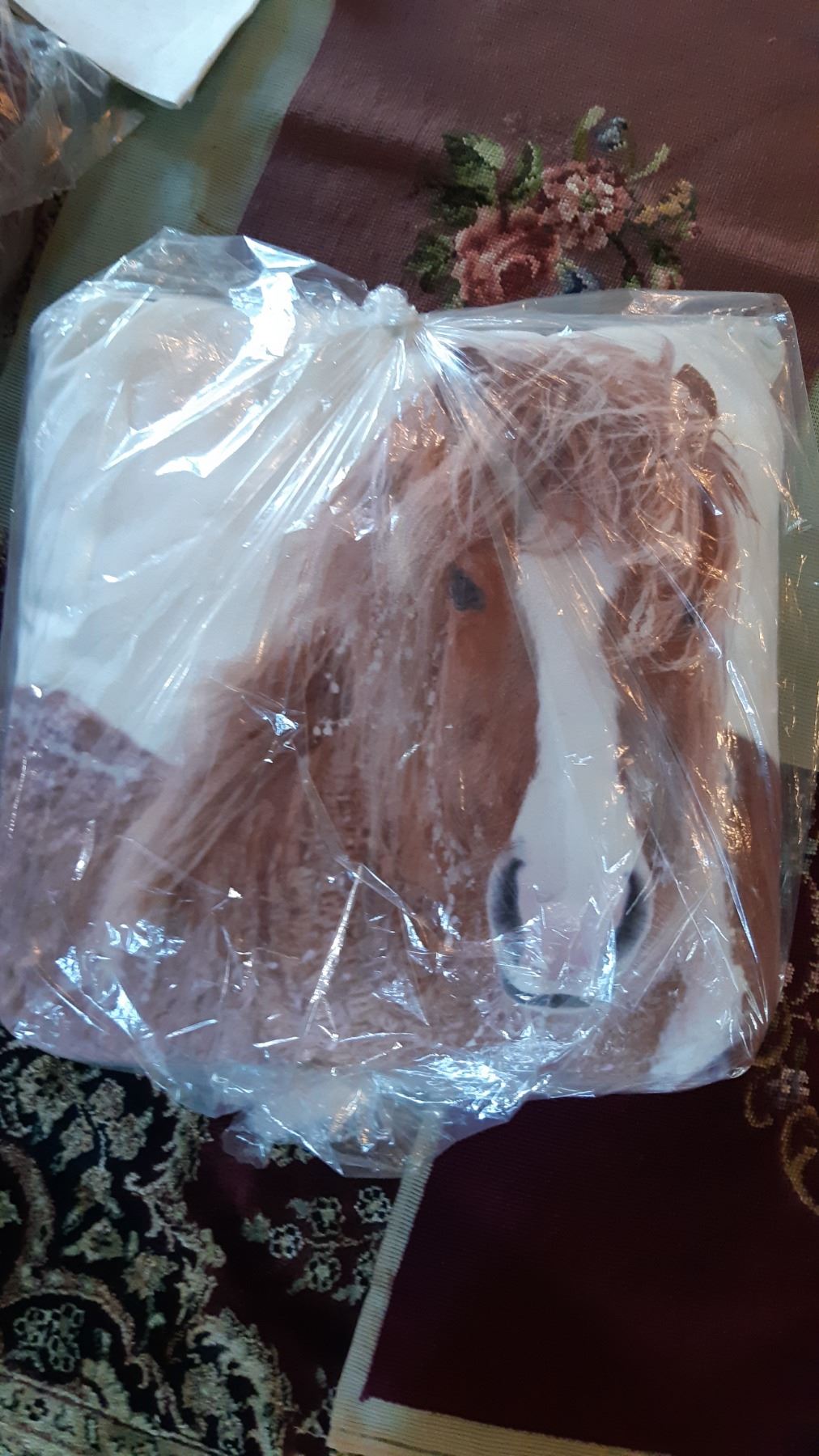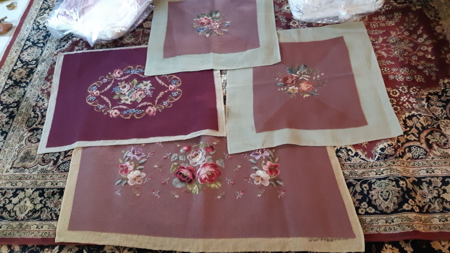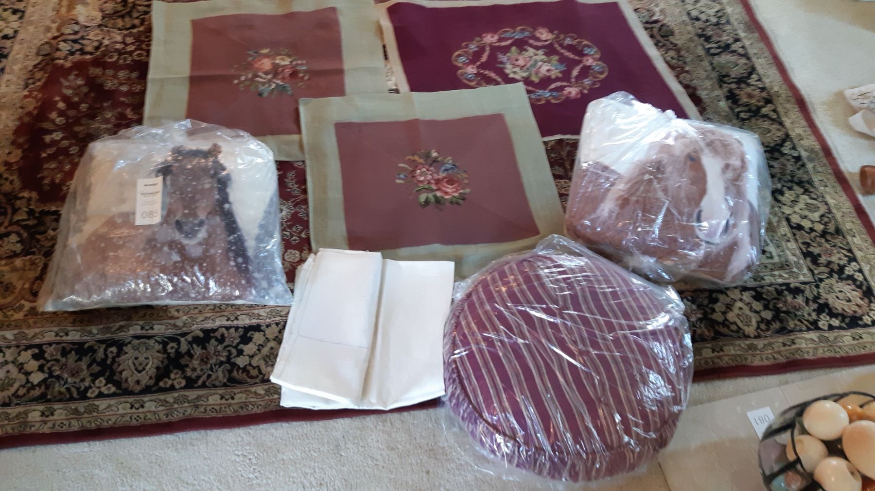 Three sofa or bed decorative cushions. One table linen. Four unused decorative seat and bench covers of various sizes.