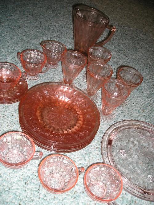 Pink Depression - Sunflower Pattern. Includes cake plate, 6 plates, 5 sherbets, cream, sugar, 4 cups, 4 saucers, and 1 water pitcher.