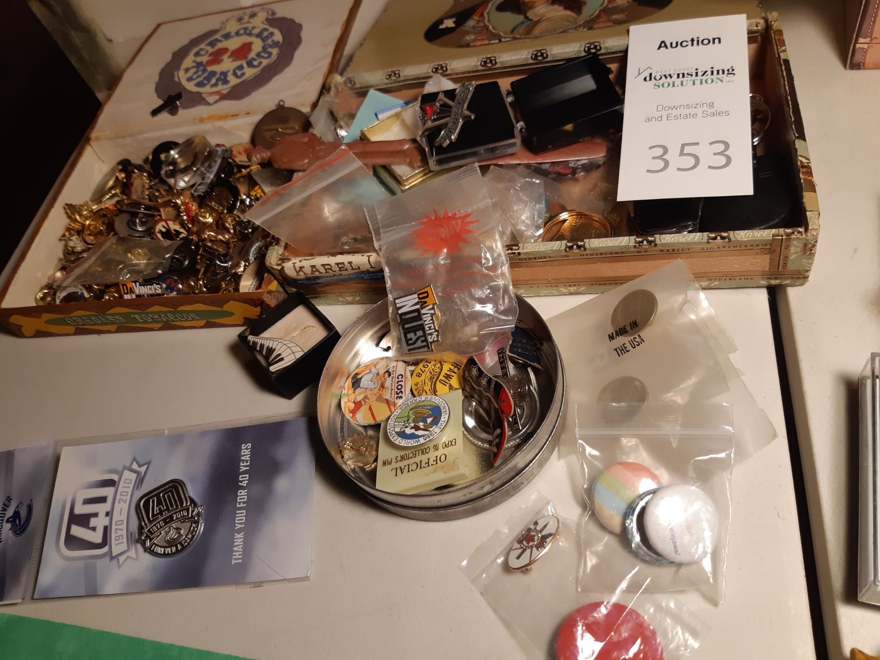 Assortment of pins, key rings, cigar boxes. Pickup at 10 am