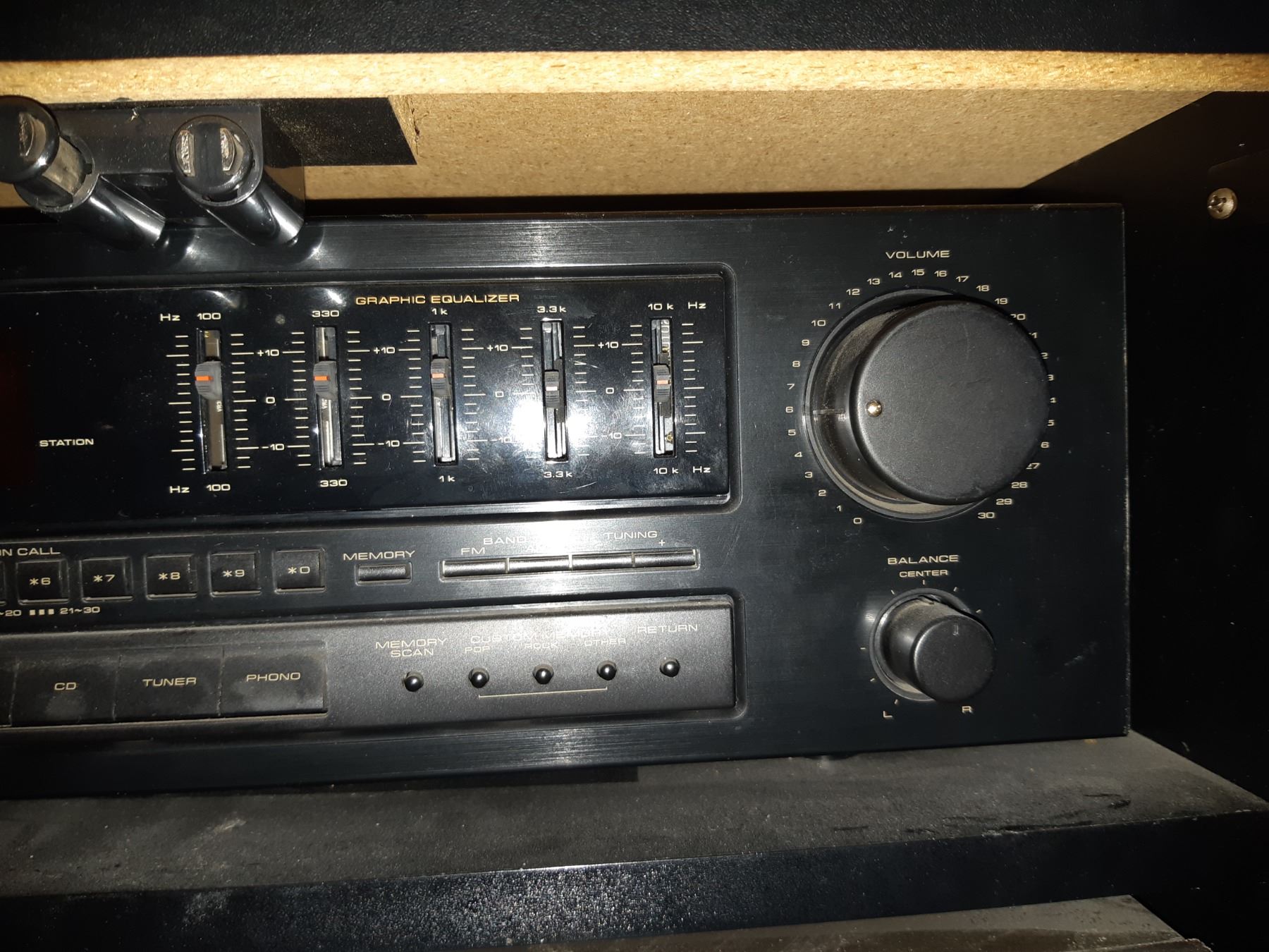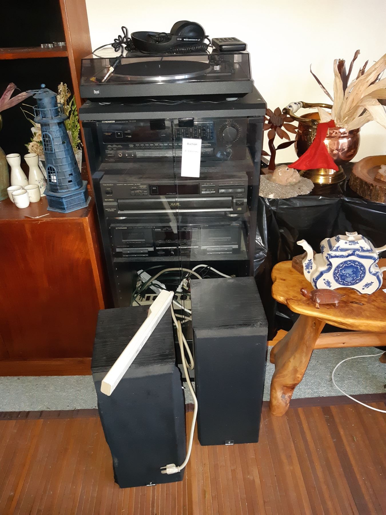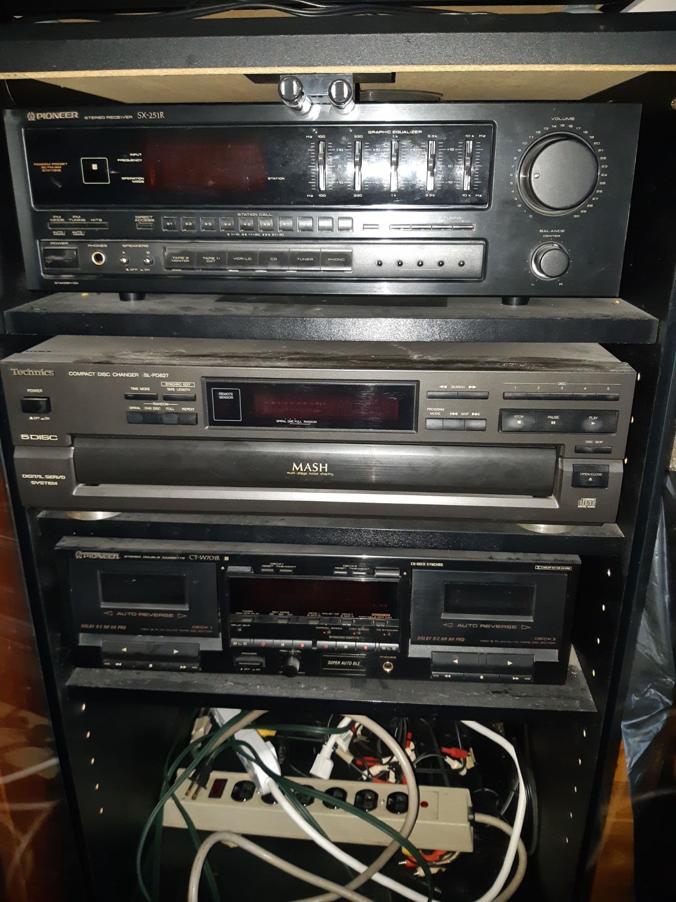 Lot includes Pioneer receiver SX25IR, Technics disk changer SLPD827, Pioneer double cassette CTW70IR, Dual turntable, 2 speakers, and stand 20x17x30.Untested. Bring help to move. Pickup at 11 am.