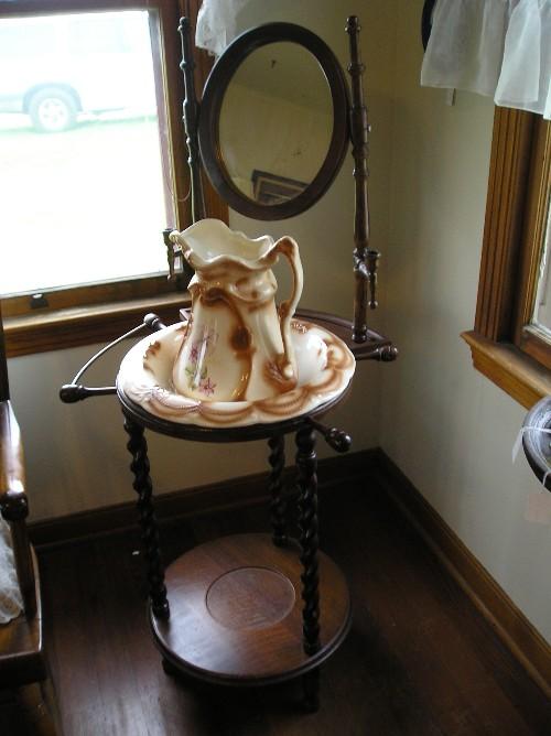 Pitcher and Bowl with stand, barley twist, mirror, side candle stands (one towel bar is missing, but can easily be replaced).