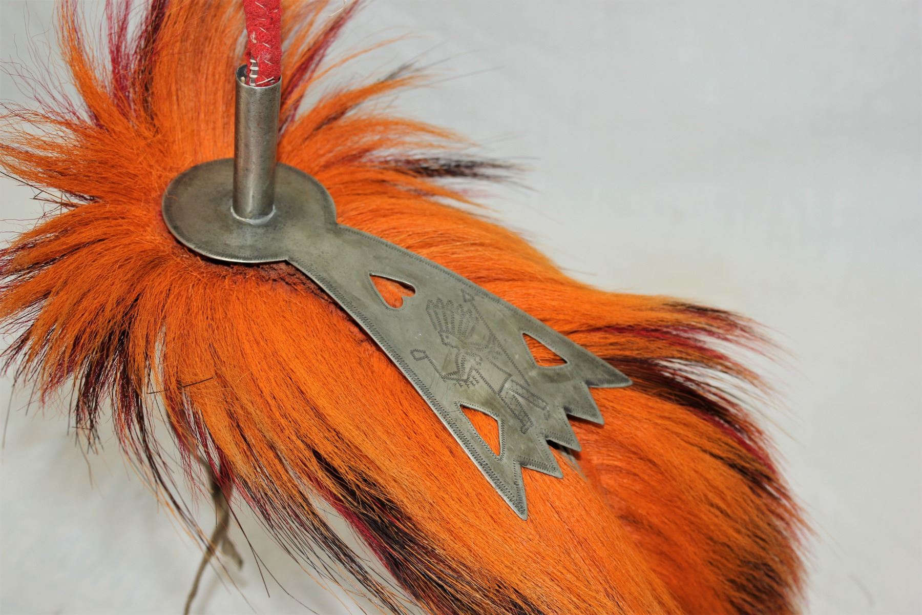 A extraordinary full porcupine roach with rich deep color, and finished by a spectacular silver spreader, with cut-out and engraved design and provision for a vertical plume.