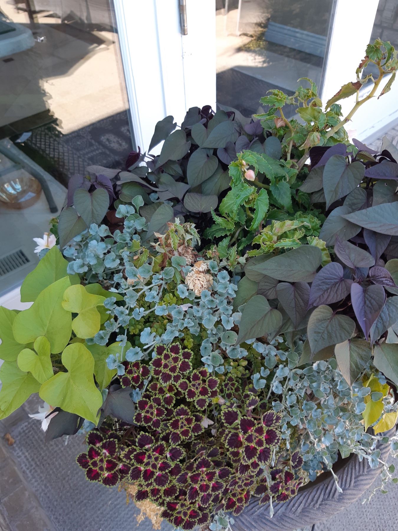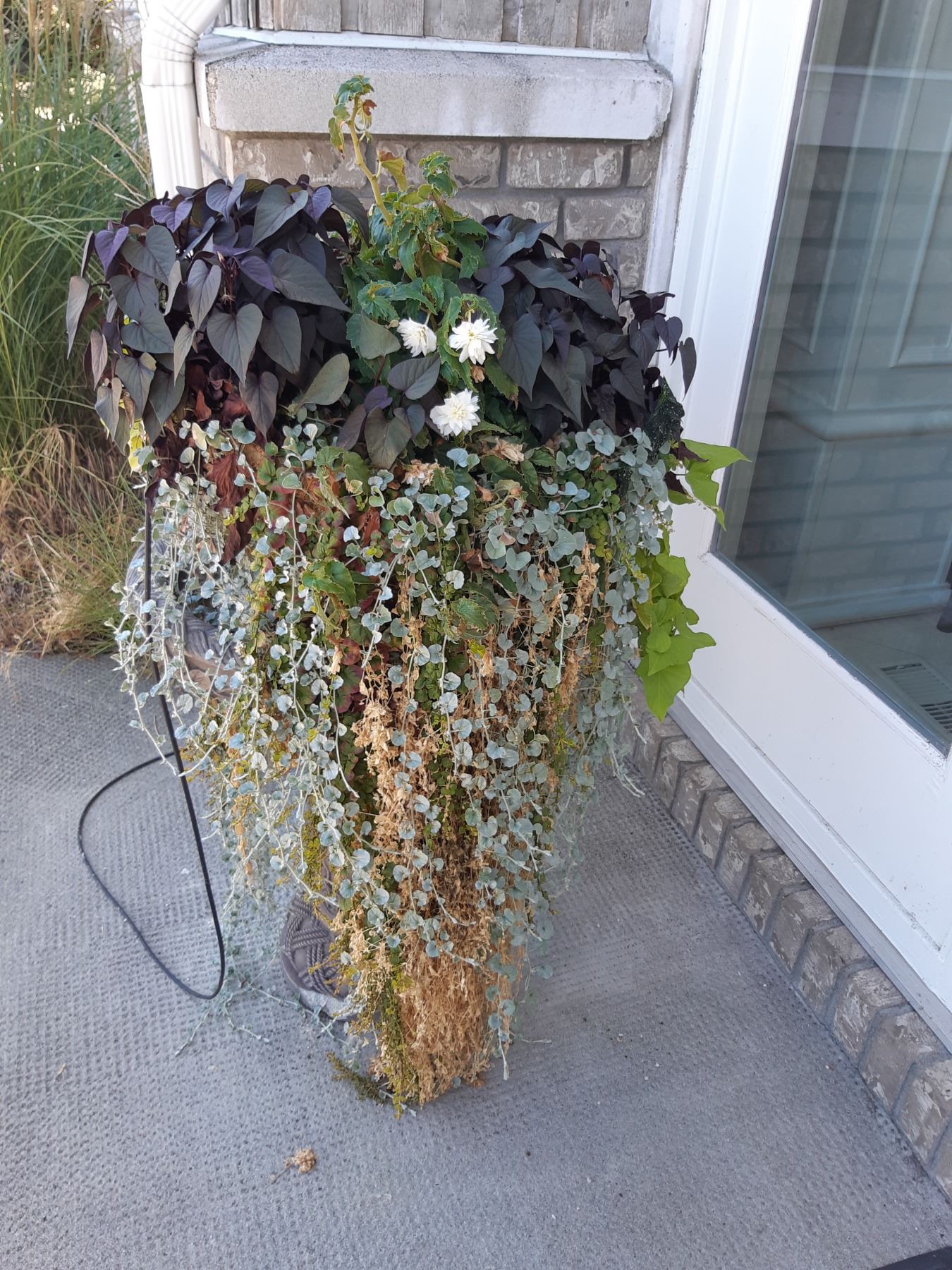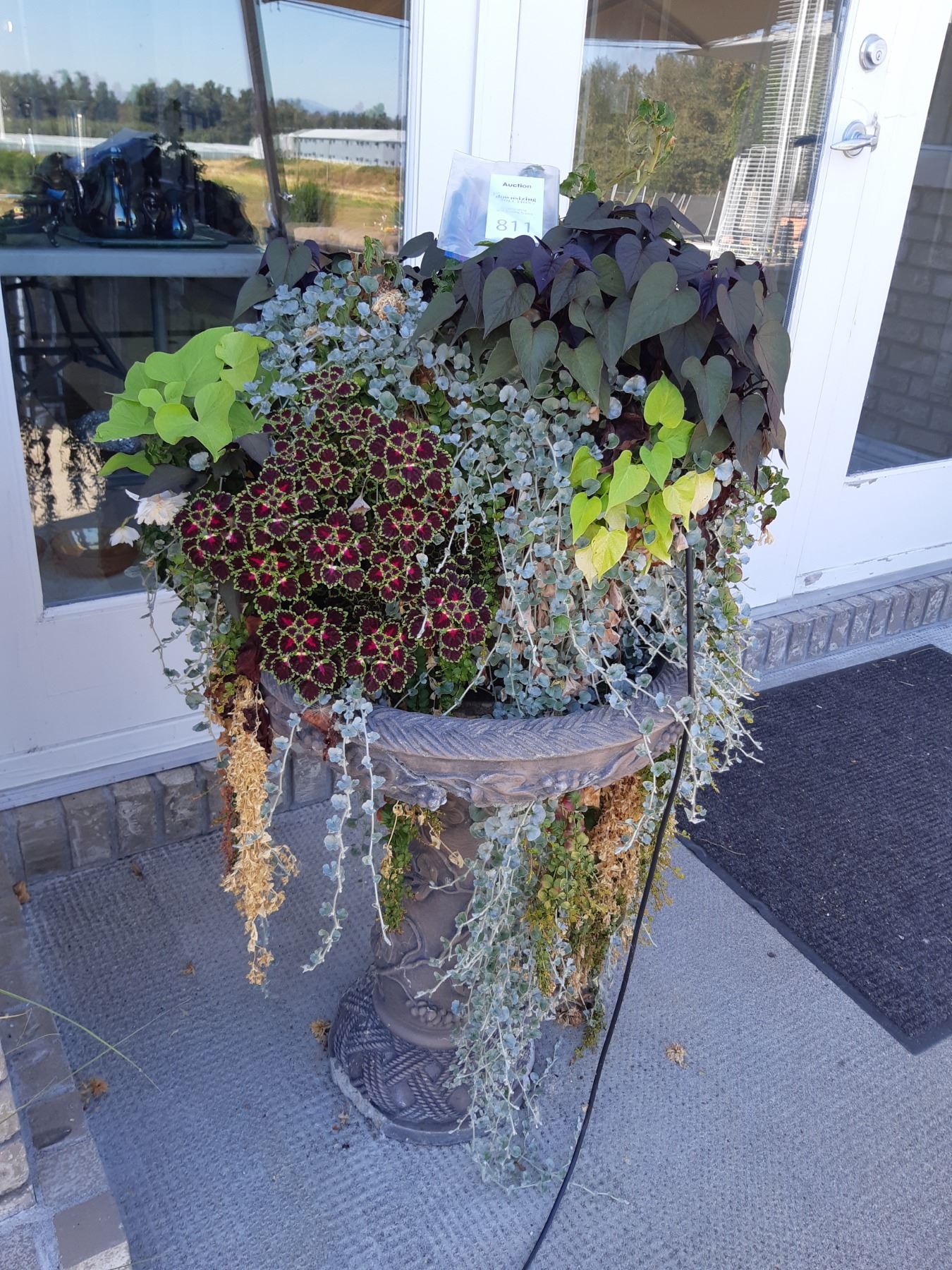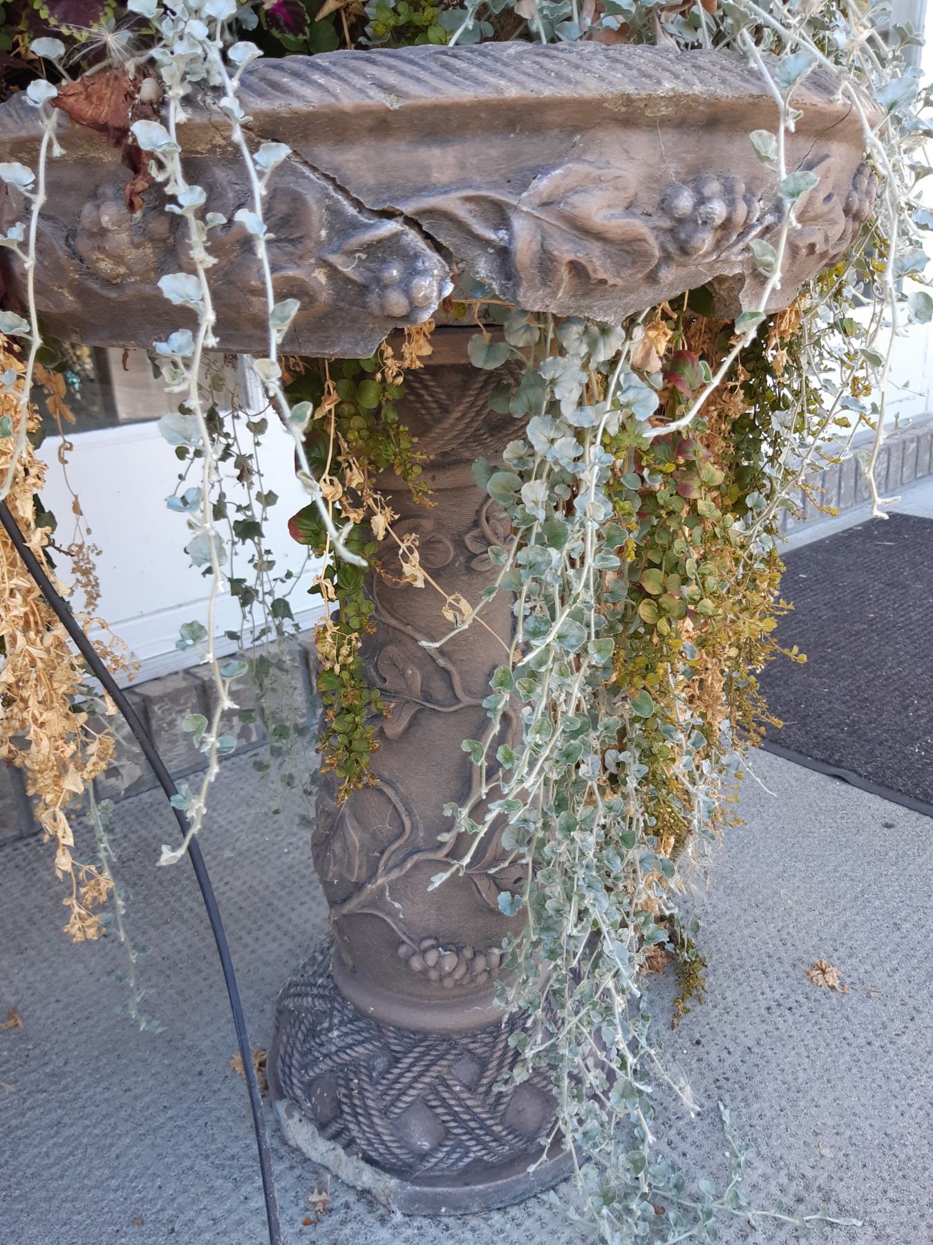 Resin planter damage around bottom with plant, 31x31x45 pickup 10:30 am
