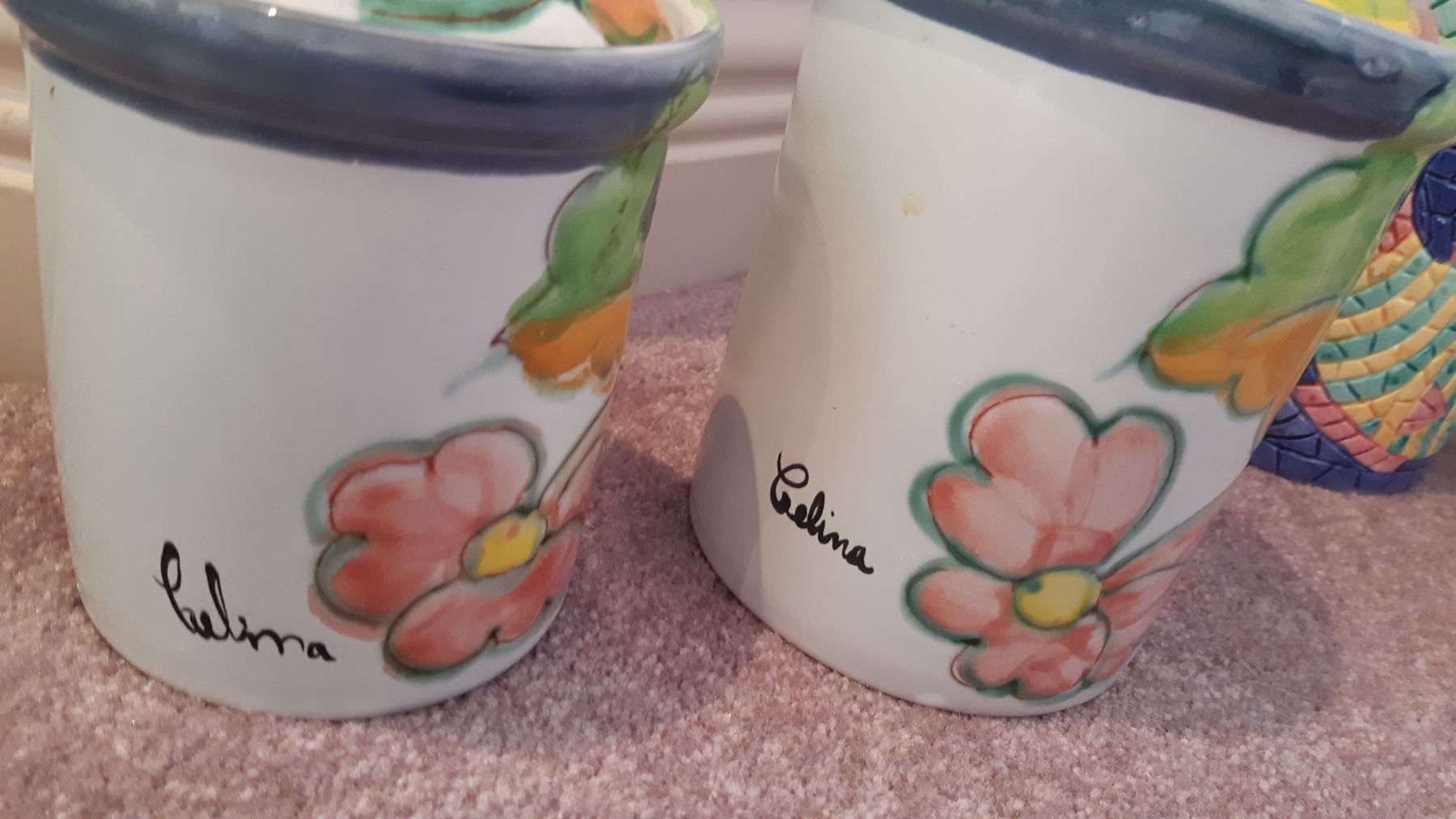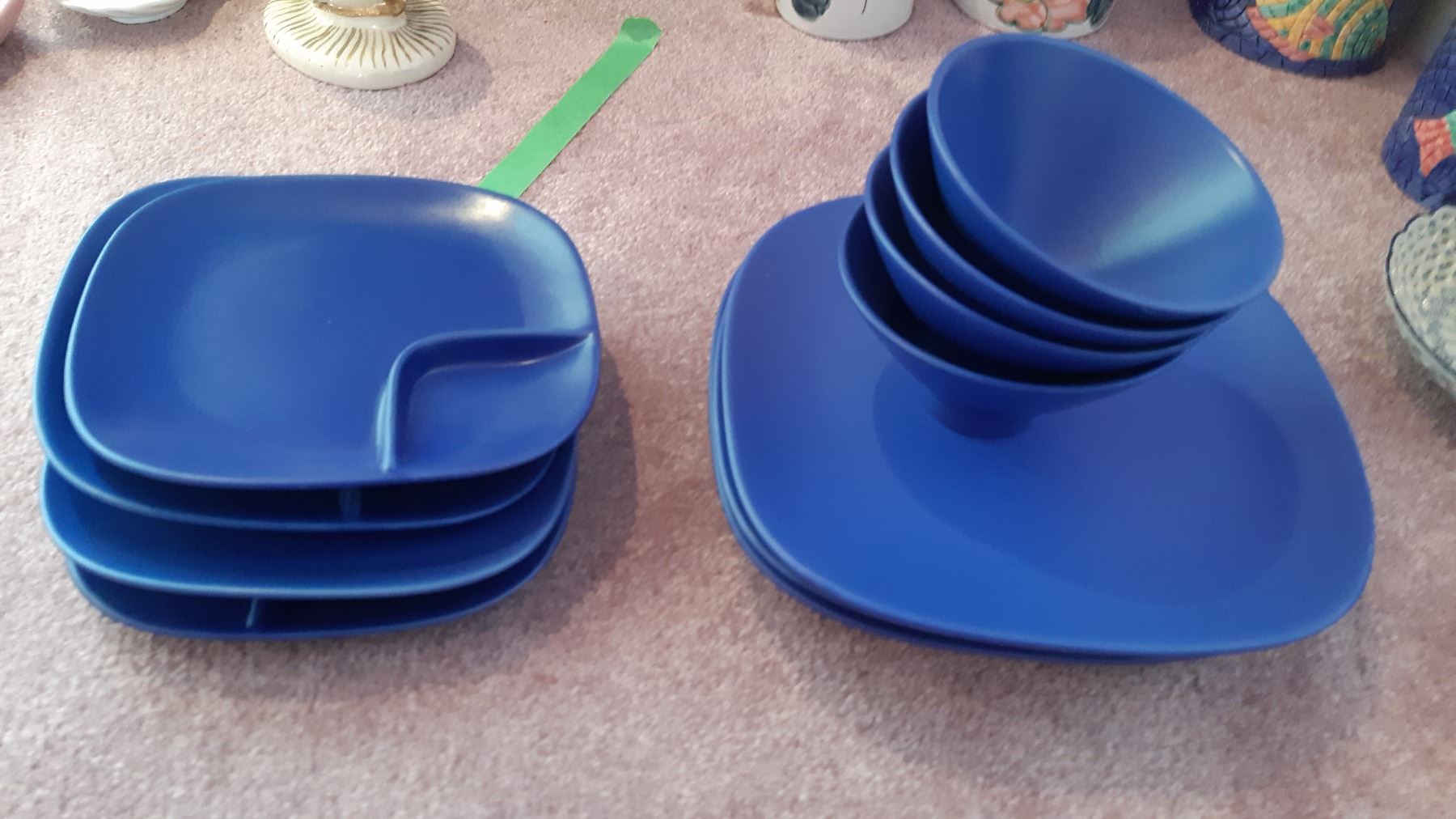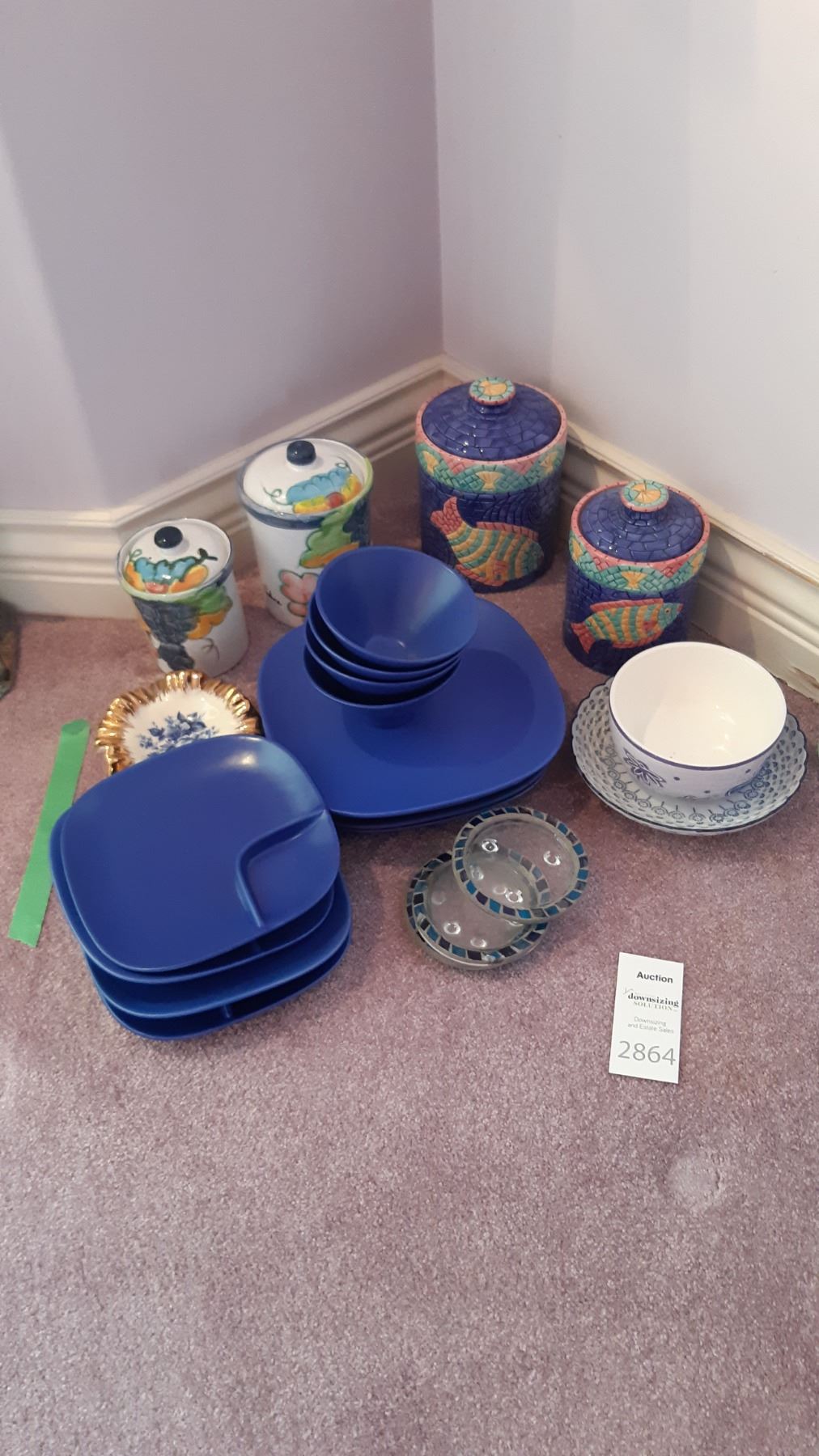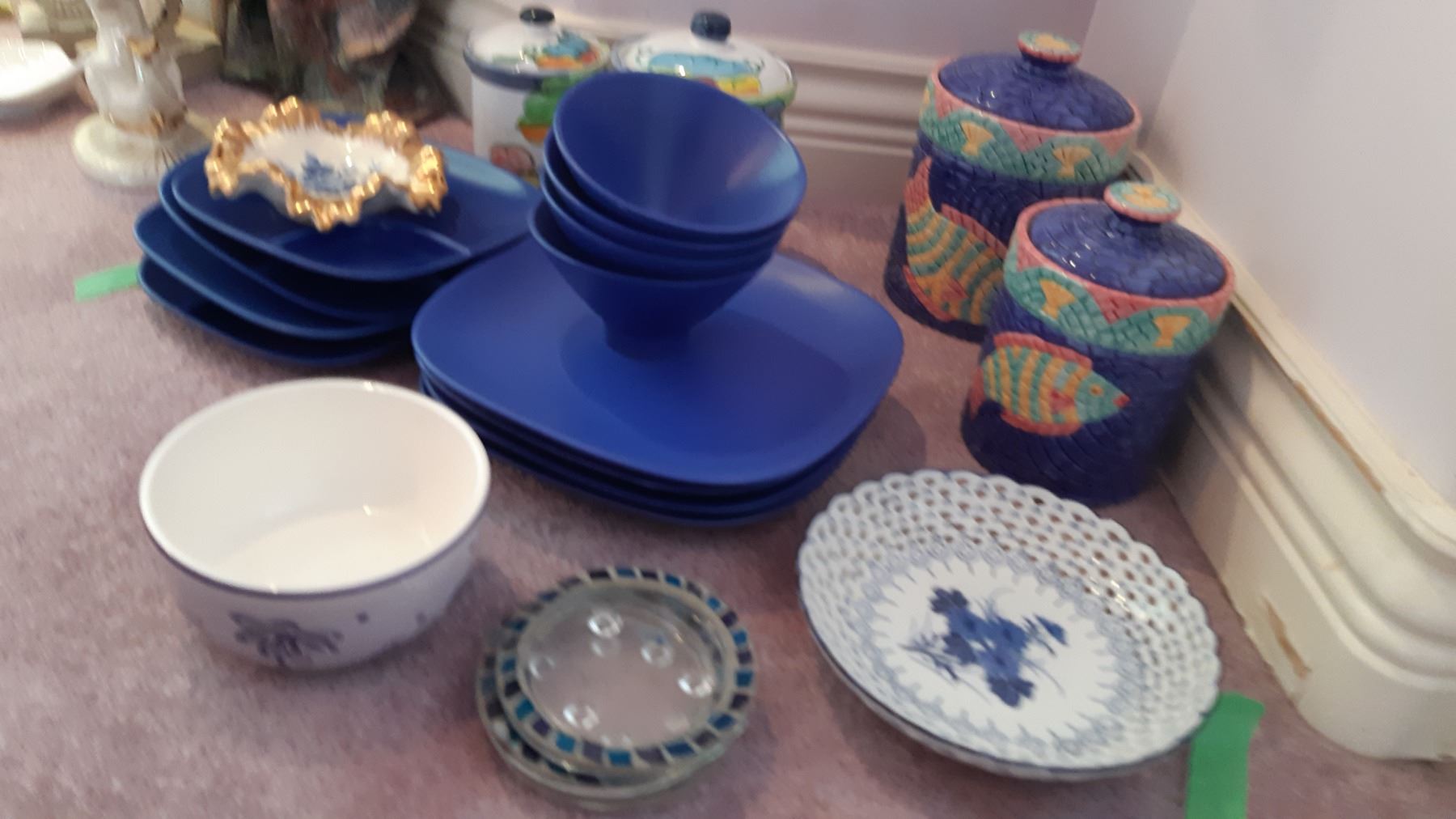 Collection of Blue Ginger tableware, 4 bowls, plates, side plates, fish theme cannisters, more. Pick up 9 am. Bring box, packing material.