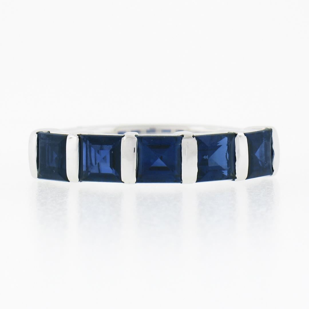 A platinum 5 stones stack ring, with 5 square cut natural sapphires (1.75ctw). The ring is size 6.5, weighs a total of 5.77 grams, and measures 4.15mm wide.
