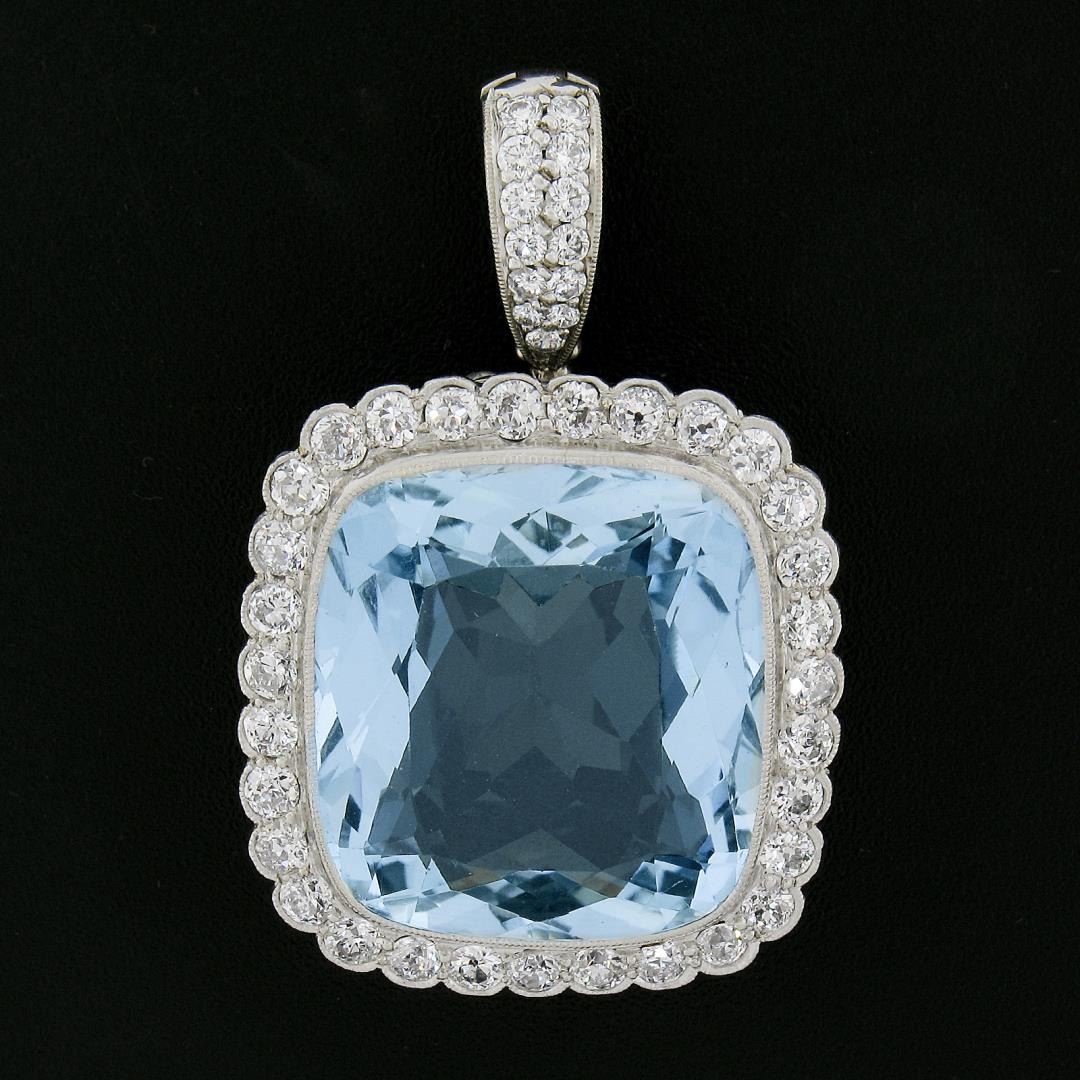 Platinum 38.9ctw GIA Cushion Cut Aquamarine Diamond Pin Brooch Enhancer Pendant